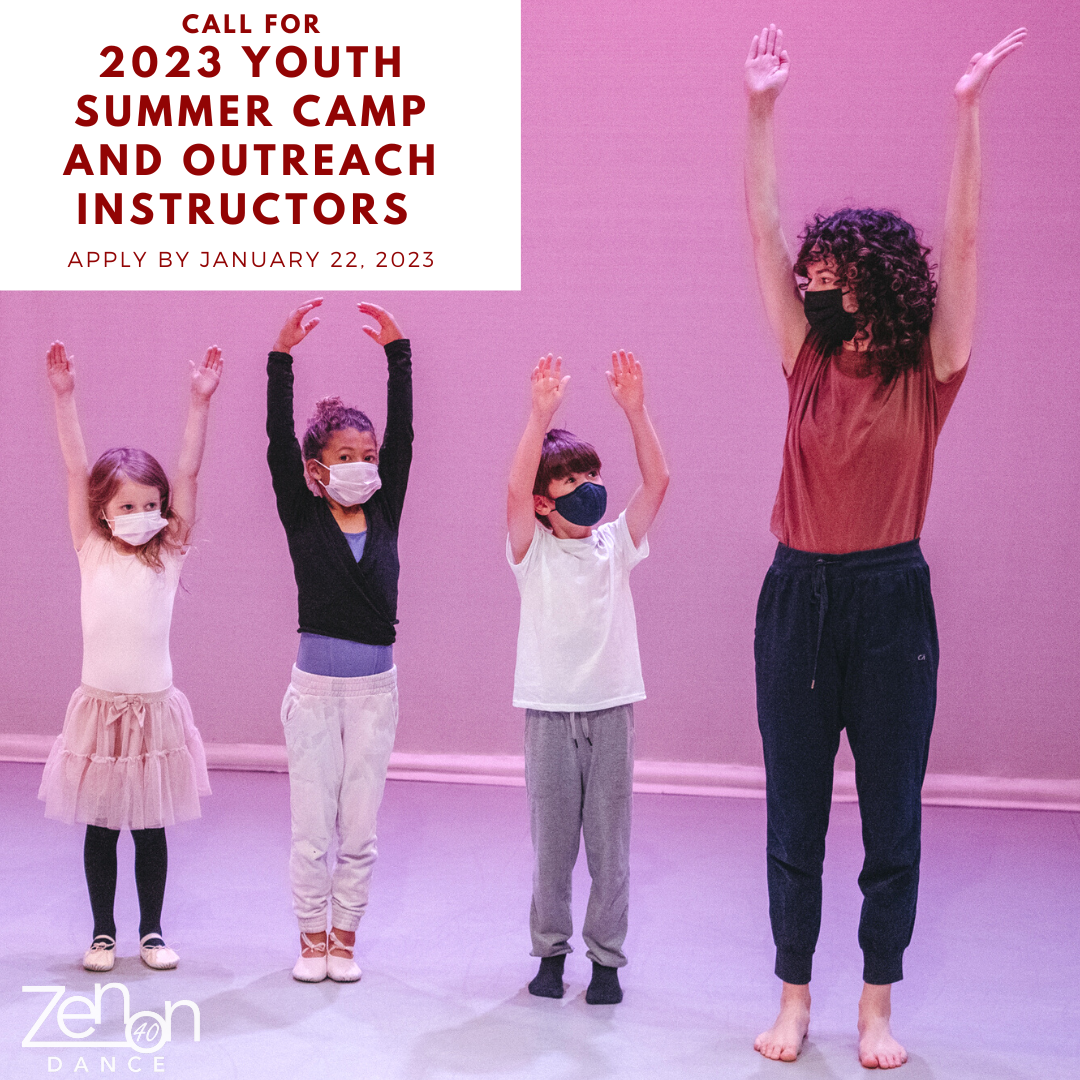 Zenon is seeking several new instructors to teach a variety of youth classes geared towards ages 3-14 for our 2023 Camp Zenon summer camp and various Summer Community Outreach programs. If you are passionate about working with young dancers and have experience teaching movement classes, we would love to hear from you.