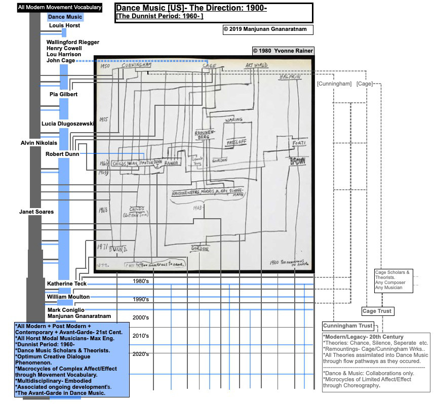 The Avant-garde of any art form is spearheaded by its artists, then documented by its scholars, theorists and historians. During the 20th century, dance [Concert Dance], with the kinesthetic body as its instrument, deconstruction as its primary process for investigations, movement vocabulary as its language, and choreography as its creative outlet, examined its inherent multi-disciplinary identity extensively resulting in the development of modern dance, followed by post-modern dance, leading us into the 21st century. Music/Sound, an integral component of this multi-disciplinary identity of dance, negotiated all aspects of these developments through both periods into the latter part of the last century, establishing a direction and a comprehensive practice in music that is now specific to dance. However, scholars and theorists on this are yet to emerge, leaving the discourse on this subject to those from both music and dance fields to collaborate on viewpoints, when called upon, deferring to each other for analysis and conclusions and almost often now, falling short. Hence, until dance music theorists and scholars emerge, those who don’t need to collaborate on the subject for analysis and conclusions, the attached diagram, incorporating Yvonne Rainer’s from 1980, reflects the extensive developments in this collaborative art form that occurred during the 20th century, from Louis Horst’s work with Martha Graham, to now, beyond the micro cycles of limited affect/effect of the situational and now ubiquitous conventional music and dance collaborations through choreography, to the macro cycles of complex affect/effect of the feedback loops and pathways of a symbiotic artistic flow of influence through movement vocabulary, and from it, the extensive multi-disciplinary explorations that occurred between some of the critical figures from both music and dance, including, extending their own creative capabilities beyond the conventional practices of their own art, all of which in turn influenced both art forms while establishing a specific, complex lineage and practice of dance music, pointing to where future directions of it will come from. Hence, the discourse on this collaborative art form of Dance and Music doesn’t have to begin at point A, as it has long ceased to be a novelty. The 21st century conversations on it can and should continue from point R. Beyond 20th century conventional collaborations to a 21st century symbiosis.