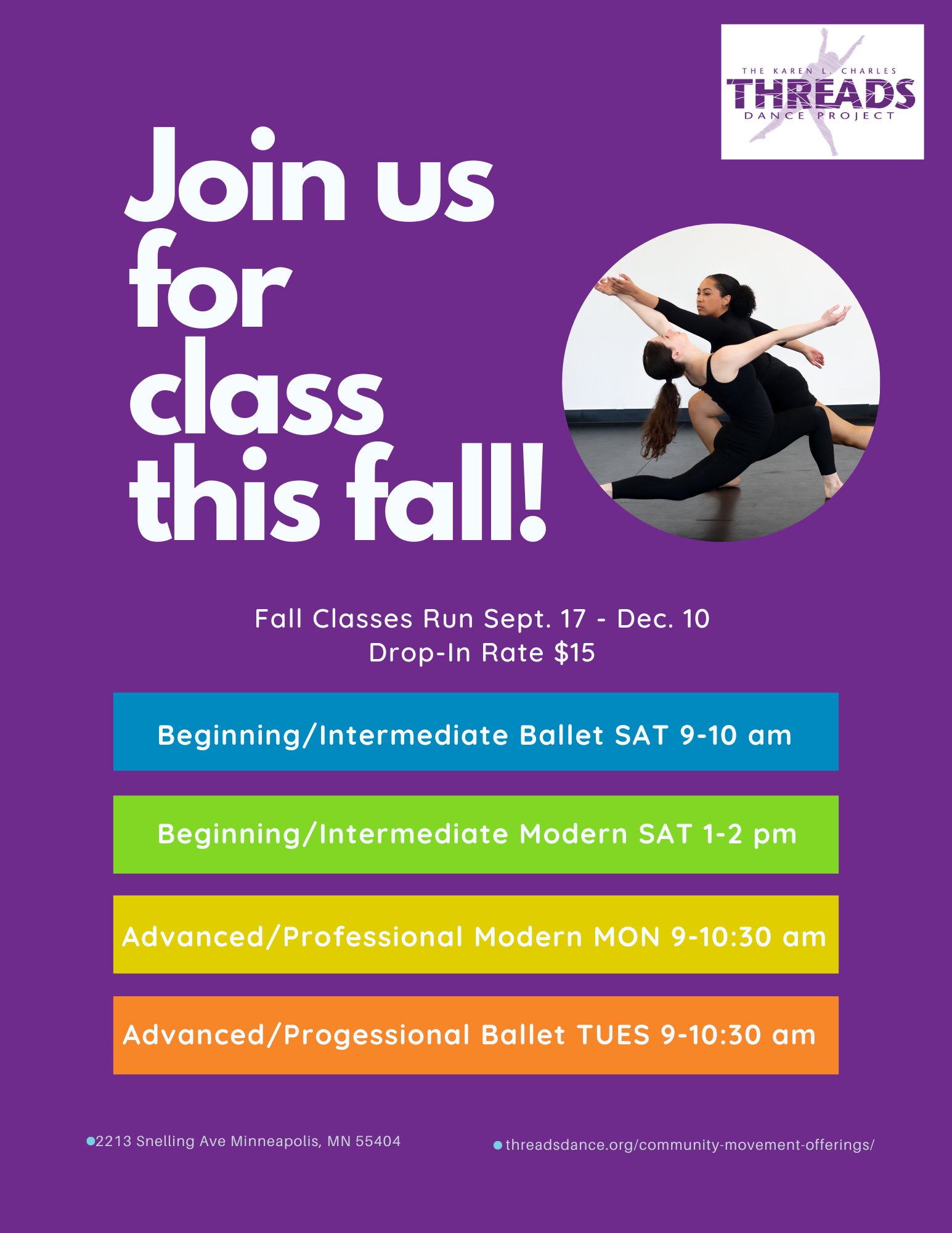 Zenon Dance School is excited to welcome you back for another season of dance this fall! Registration is open for the Fall Session, September 12-December 18. There will be no classes the evening of Wednesday, November 23 through Sunday, November 27.