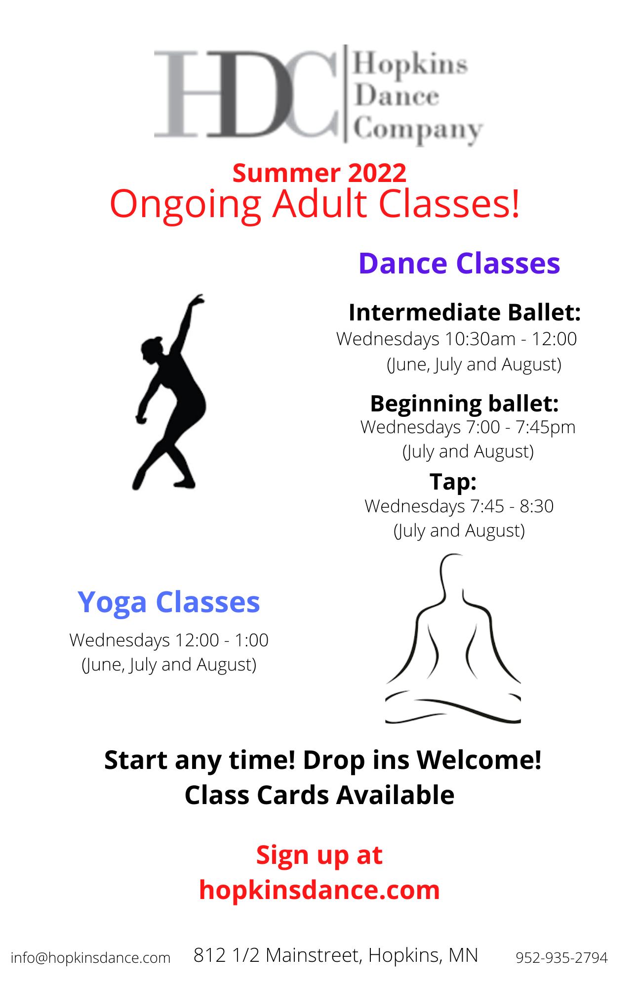 Adult Classes at Hopkins Dance Company: Ongoing adult classes for the summer at Hopkins Dance Company in ballet, tap and yoga.