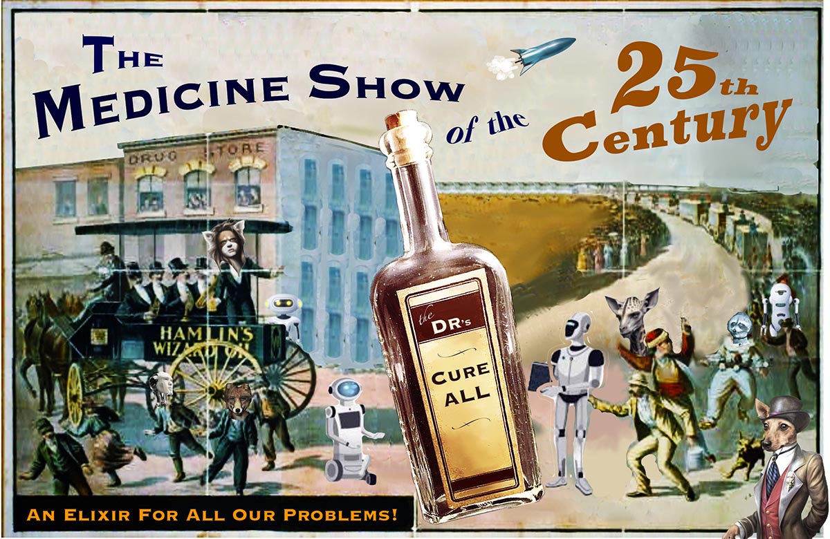 This year’s touring production is The Medicine Show of the 25th Century, where in the distant future we follow a troupe of A.I.-hybrid humanoids on a quest to find the mythical “perfect human being”. To fuel their quest, they travel from town to town, hawking a cure-all elixir to an audience desperate for solutions to the world’s toughest problems.