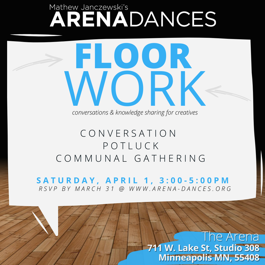 This April Floorwork will focus on artist residencies – conversation assisted by April Sellers of April Sellers Dance Collective, Liz Engelmen of Tofte Lake Center, and Sharon Mansur, an Arab/SWANA American experimental dance and interdisciplinary artist who will be joining us via Zoom. Conversation will be held over a communal meal – bring your own dish to share in our potluck! ARENA DANCES will supply beverages, plates, napkins, and utensils.