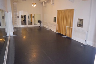 Our space offers 1,305 square feet (30×40) of sprung floor, Marley dance flooring, full wall-length mirrors (with curtains for covering if preferred), free wifi and a changing room.