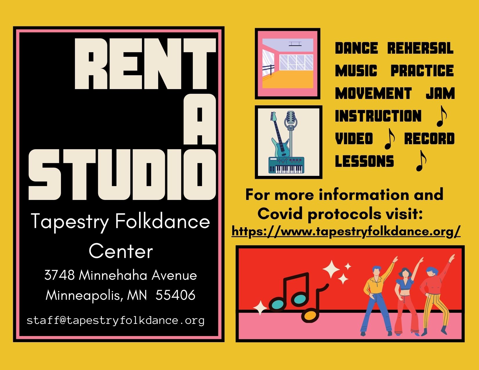 Welcome to our beautiful studios! Tapestry Folkdance Center’s large and small studios are perfect for limited in-person and online teaching, choreographing, rehearsing, movement sessions or music concerts.