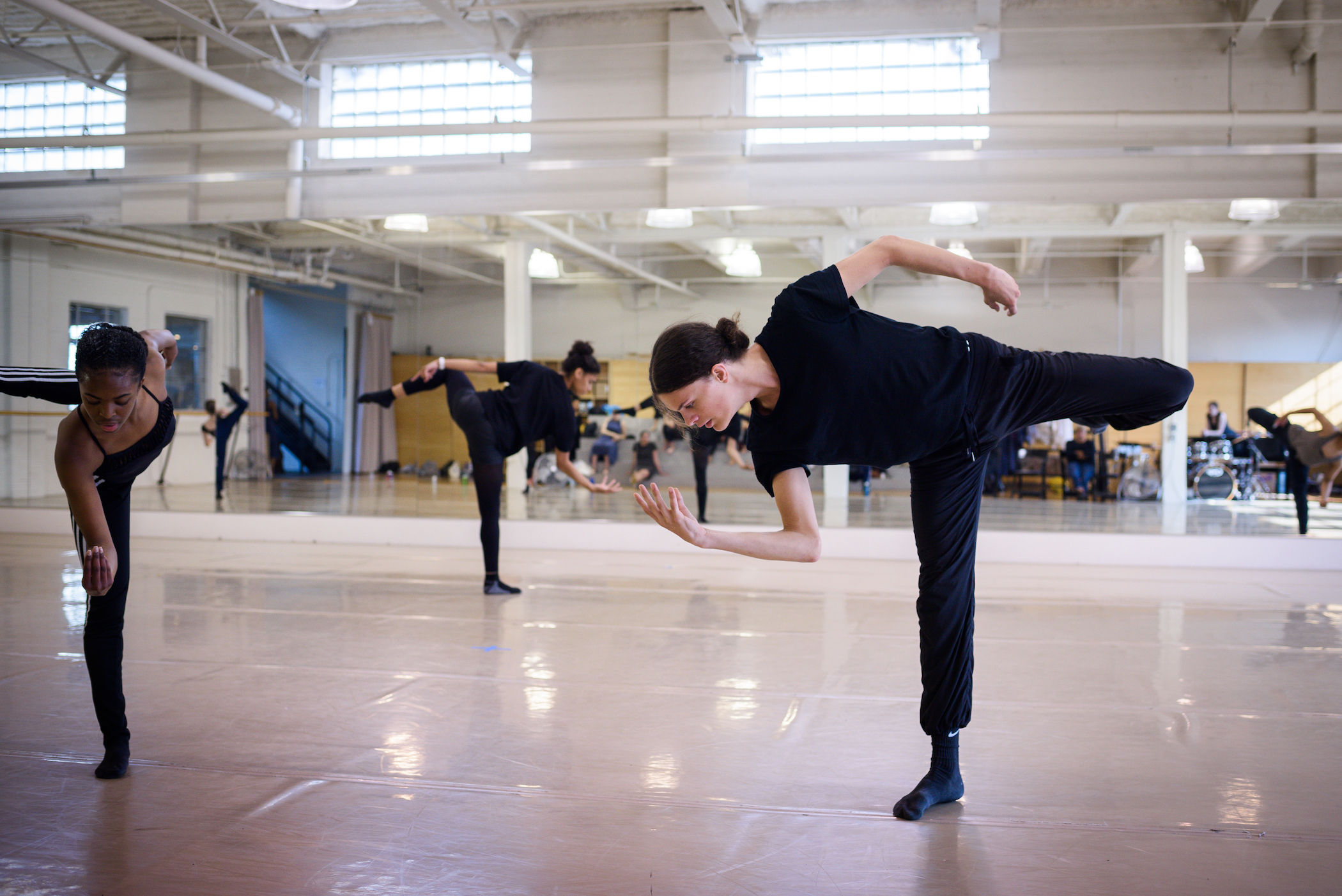 An image of the Nexus dance studio, with a wall of windows and black Marley floor