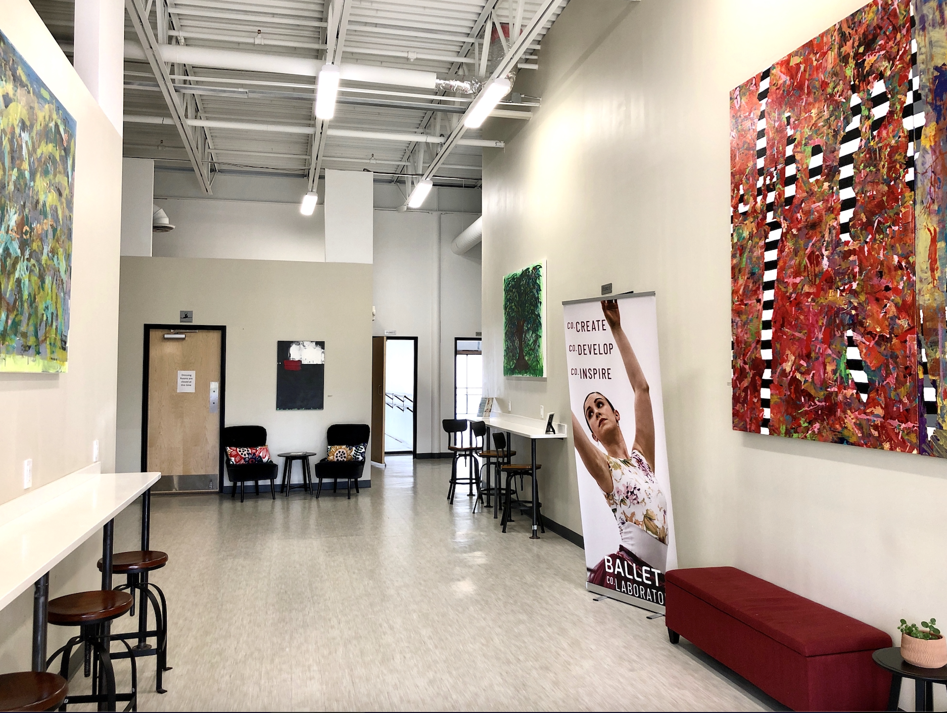 We have five studios at Ballet Co.Laboratory with sprung floors, floor-to-ceiling mirrors, and barres, plus four gender-neutral restrooms, changing rooms, and comfortable lobby space with Wi-fi access and ample seating. The entire facility is HVAC heated and cooled.