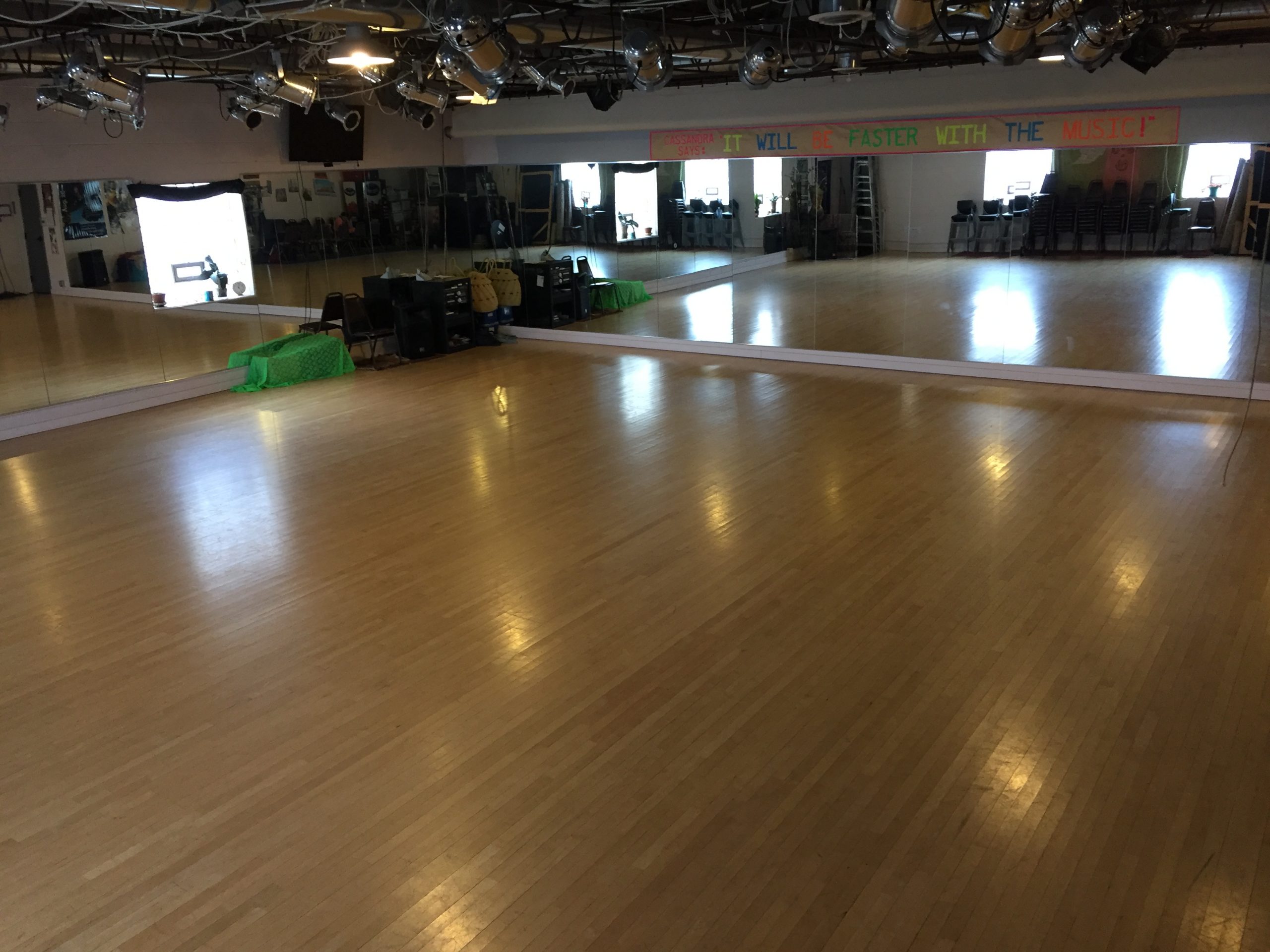 Studio 1 has 1700 square feet of sprung floor, full wall-length mirrors, Rosco Adagio Marley dance floor, high ceilings, sky lights, and 3 chandeliers.