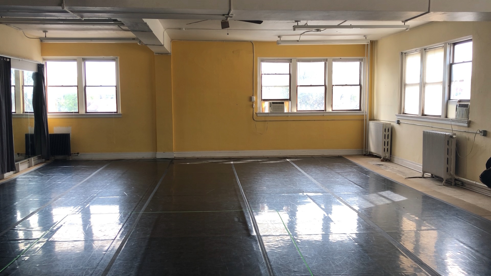 Studio 1 has 1700 square feet of sprung floor, full wall-length mirrors, Rosco Adagio Marley dance floor, high ceilings, skylights, and 3 chandeliers.