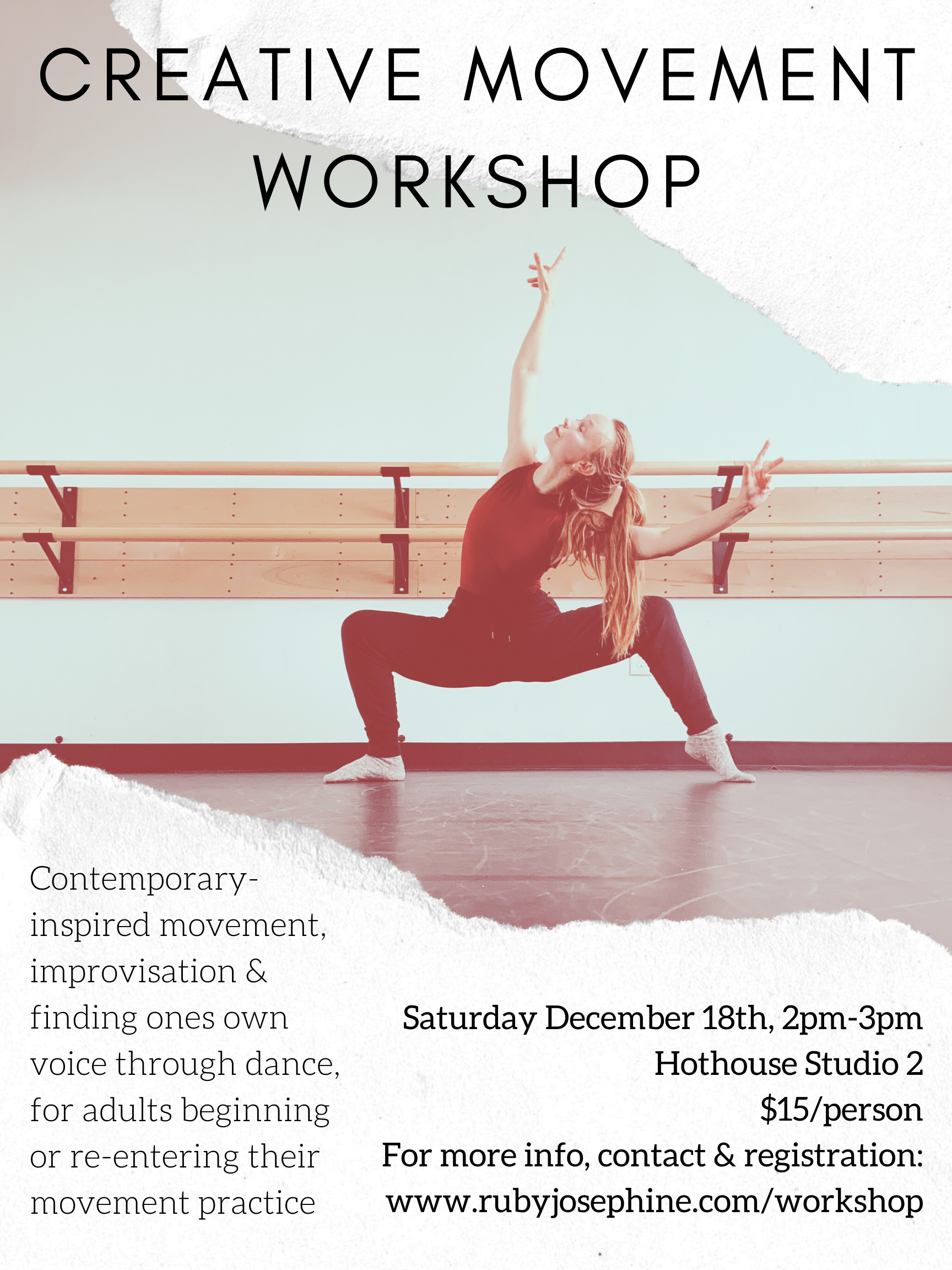 Creative Movement is a workshop for adult movers who are just beginning to enter, or re-enter, a movement practice and are curious about improvisation within the realm of contemporary dance. However, more experienced movers are also welcome in order to explore their own practice in a relaxed and open environment.