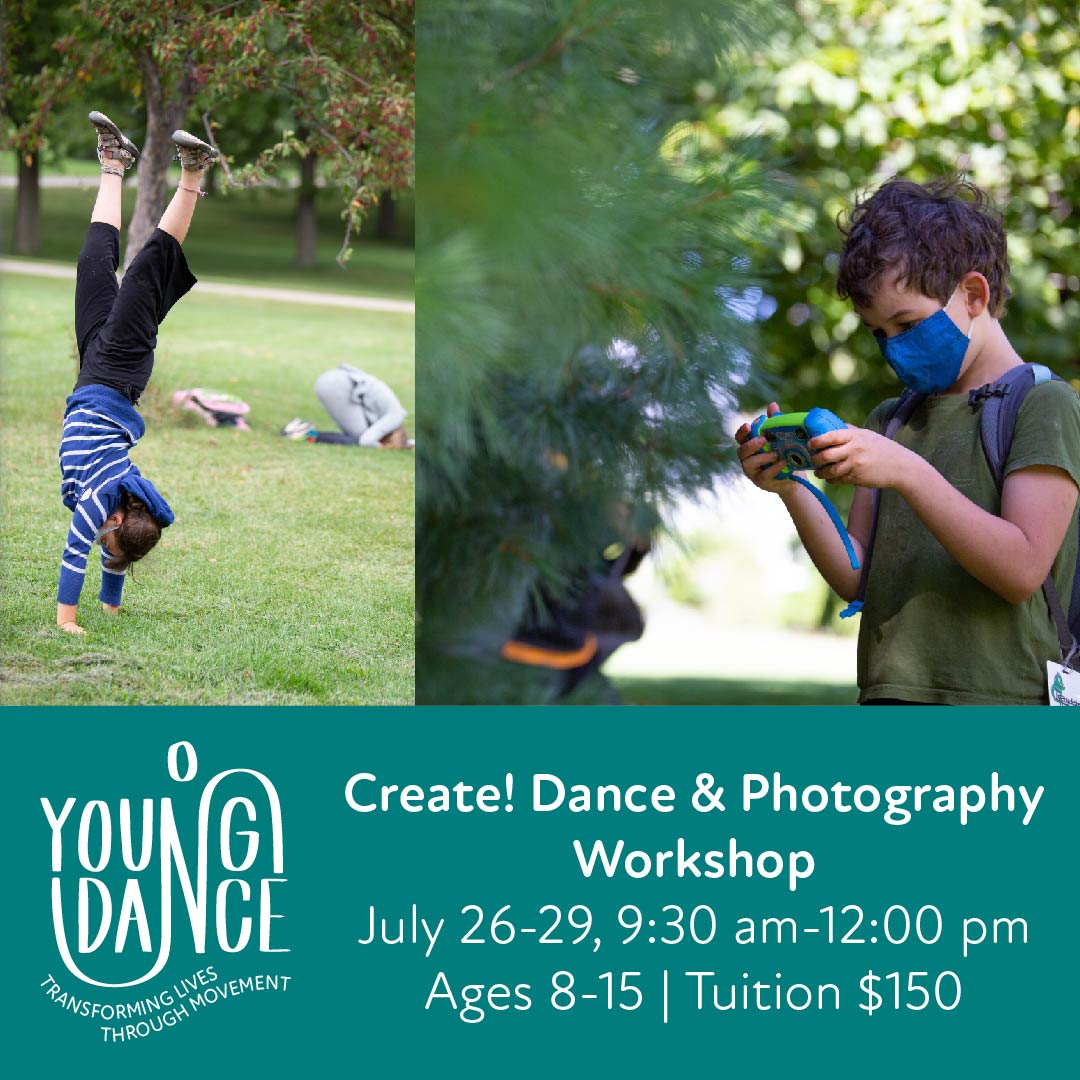 Experience the joy and fun of dance, while learning the elements of photography and how images can inspire choreography and creativity! Each day will consist of a group photo walk to help participants focus on their photography goals and let them practice the new skills they’ve learned. During these photo walks, they will develop and hone their visual acuity, looking for the light, shadows, shapes, and more. The participants will then apply the elements of photography to movement sessions in creation and dance technique.