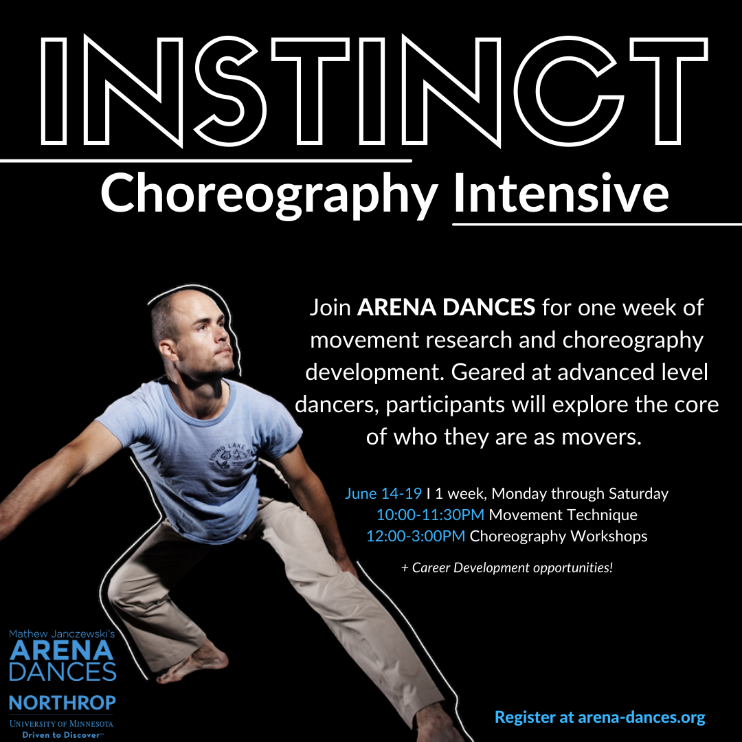 The week will culminate in an informal showing for friends, family and the community. A unique opportunity to dance in Northrop Auditorium’s Hubbard Broadcasting Rehearsal Studio. Additionally, participants will be considered for apprenticeship positions with ARENA DANCES’ for the ‘21-22 Season.