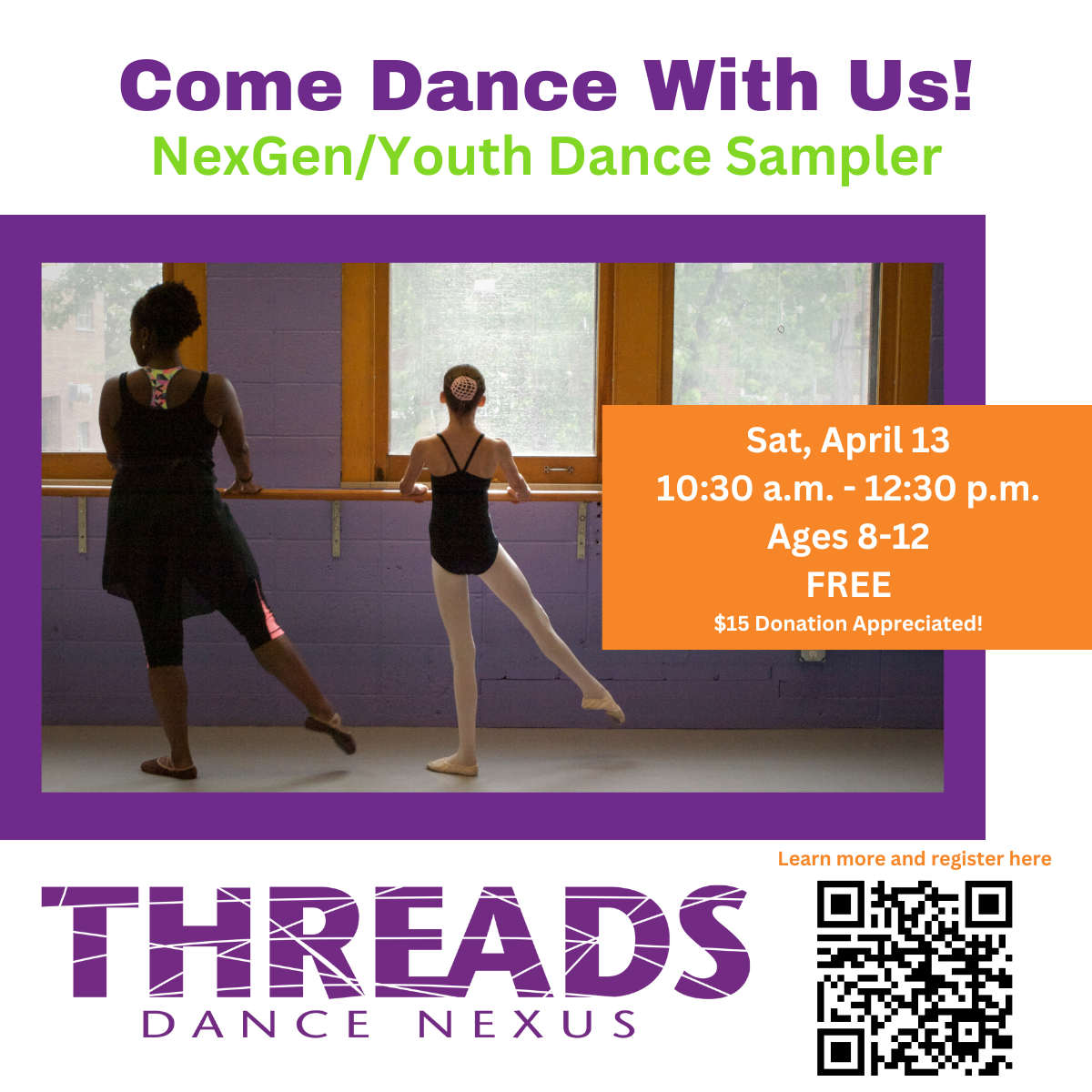 Families are encouraged to stay, join the workshop with their kids, and learn more about the NexGen/YDP program and our Summer Dance CampsAll Dance Sampler attendees will receive a 10% discount on summer camps. We can’t wait to see you at Threads Dance Nexus!
