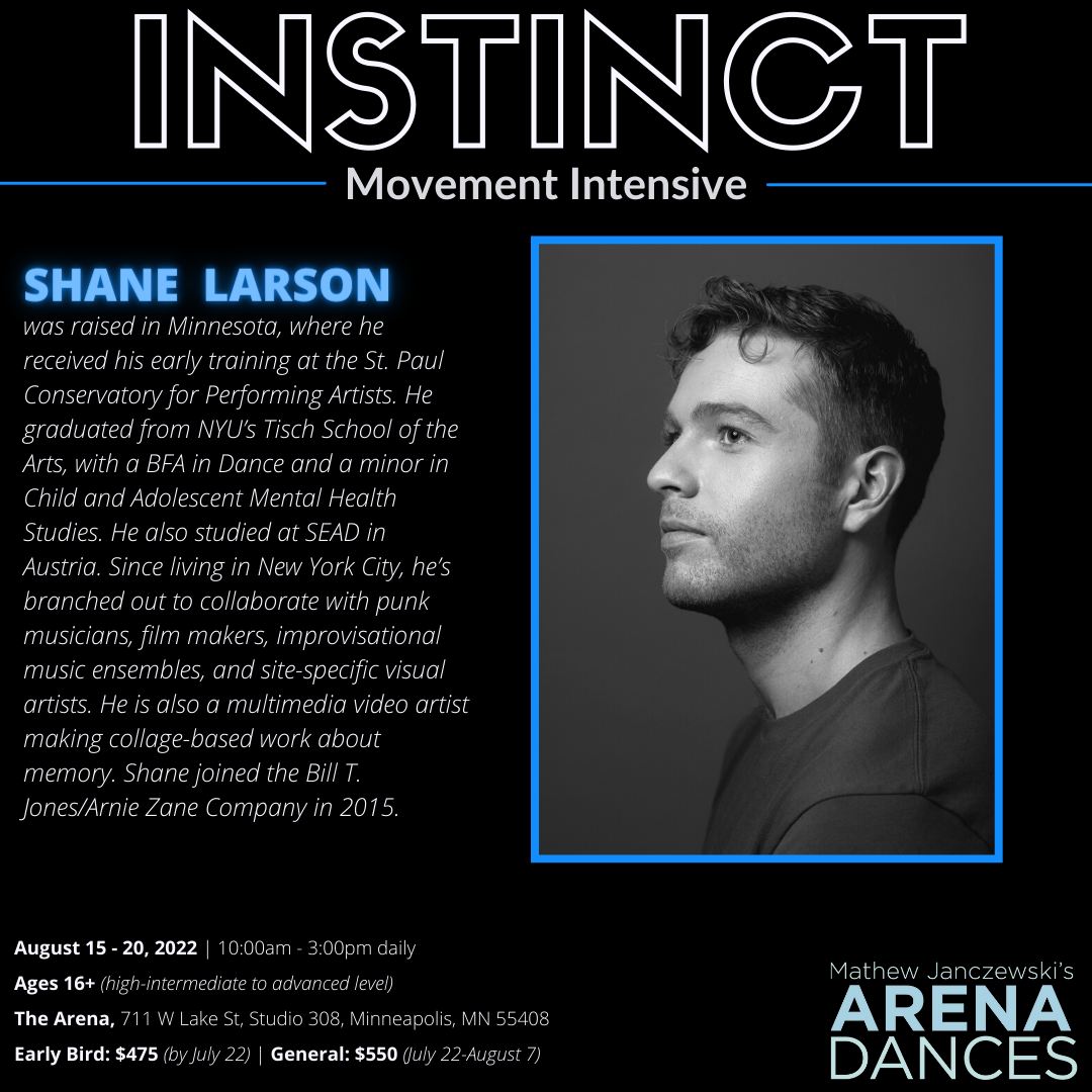 Join ARENA DANCES for one week of movement classes taught by guest artist Shane Larson, member of the renowned Bill T. Jones/Arnie Zane Dance Company. Participants will practice contemporary dance technique and learn a new original work as a part of this intensive. Targeted for the high-intermediate to advanced level dancer.