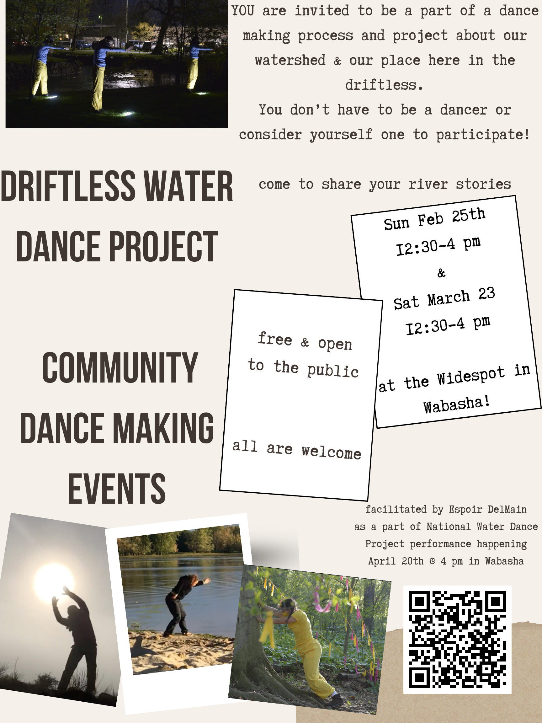 ALL are invited to help inform and participate in a dance making process as a part of the Driftless Water Dance Project (page on FB) for two workshops at the WideSpot Performing Arts Center in Wabasha MN from 12:30-4 on Feb 25th and March 23rd, culminating in a performance April 20th @ 4 pm. Around the nation people are making dances around this years theme of “Remembering Water’s Way” as a part of National Water Dance. Come participate in our community’s chapter of this larger project, event is free & no dance experience necessary- come at any time all afternoon even if just to share your stories about the river & our place on Dakota land here on the Mississippi River in the Driftless.