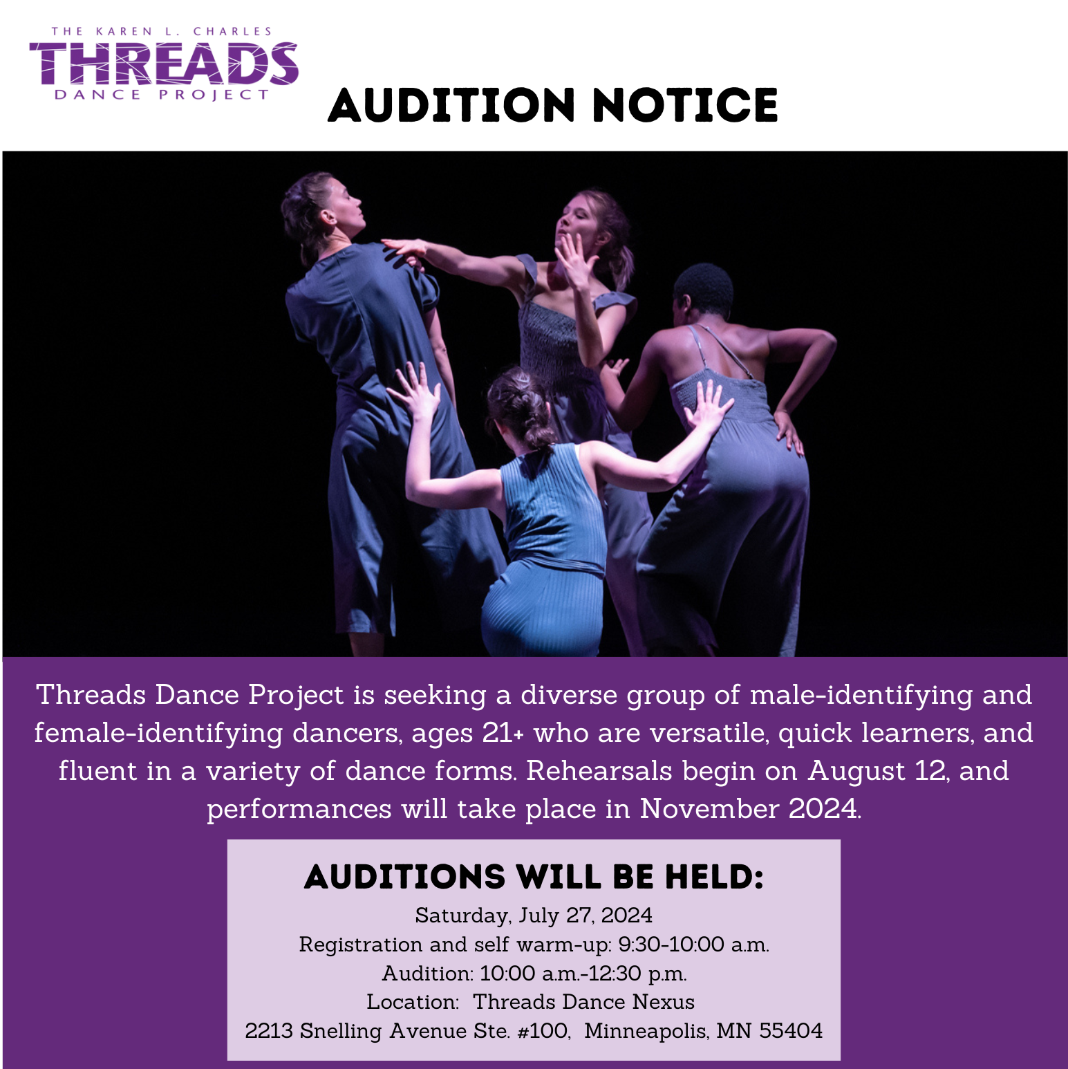 In-person audition: We’ll be teaching some phrases from pieces we’ve already choreographed for the show as well as giving some space for improvisation. Wear whatever makes you comfortable!