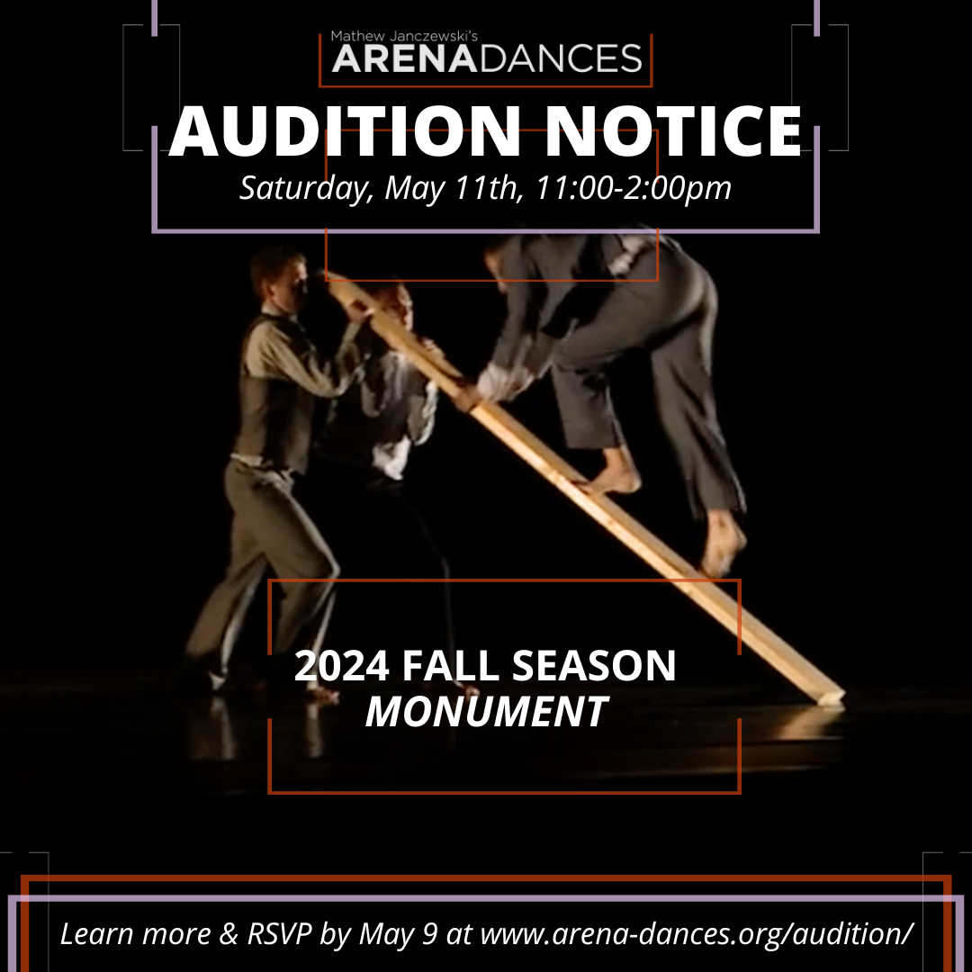 Twenty-Ninth Fall Season: Monument – ARENA DANCES’ artistic director, Mathew Janczewski, and fellow collaborators Dustin Haug, Leslie O’Neill, and Laura Selle Virtucio seek dancers to remount several repertory works including a male-identified quartet (“huddle”), mixed quartet (“Gershwin Suite”), and mixed septet ensemble (“Navigations”), that will perform September 10-15, 2024 at Luminary Arts Center.