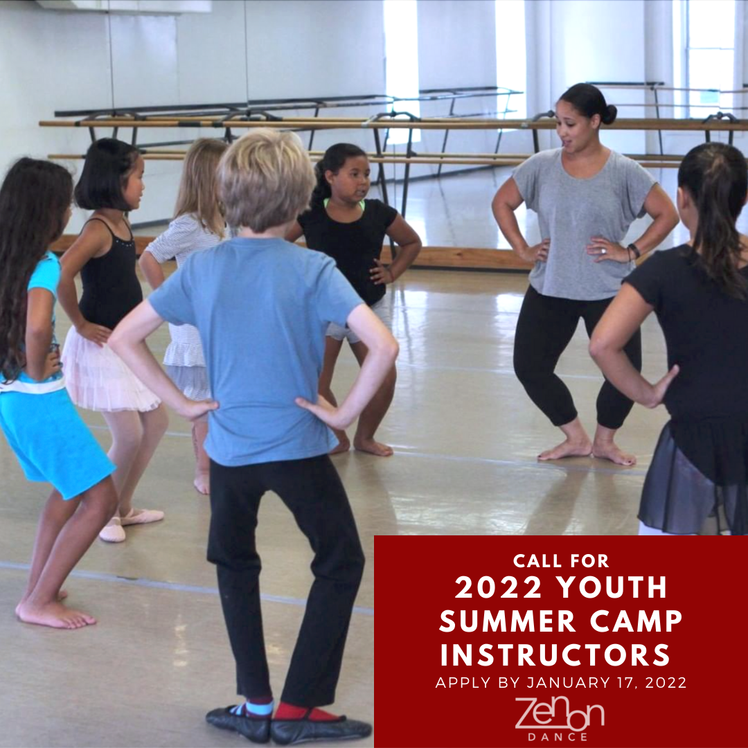Zenon is seeking several new instructors to teach a variety of youth classes for our 2022 Youth Summer Camps. If you are passionate about working with young dancers and have experience teaching movement classes, we would love to hear from you.