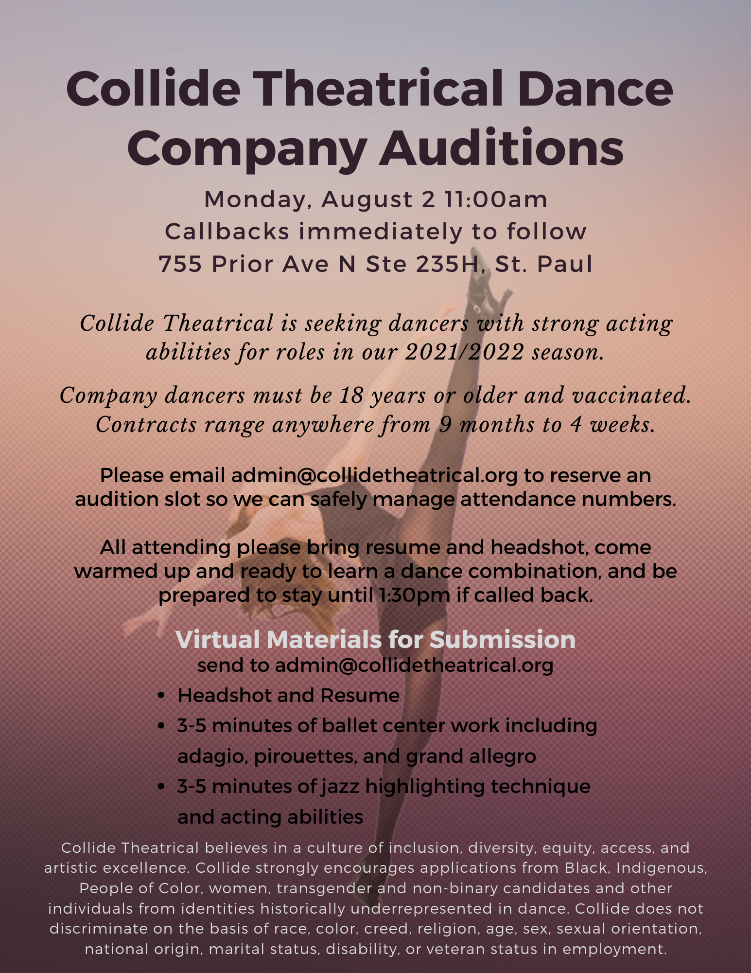 Collide Theatrical believes in a culture of inclusion, diversity, equity, access, and artistic excellence. Collide strongly encourages applications from Black, Indigenous, People of Color, women, transgender and non-binary candidates and other individuals from identities historically underrepresented in dance. Collide does not discriminate on the basis of race, color, creed, religion, age, sex, sexual orientation, national origin, marital status, disability, or veteran status in employment.