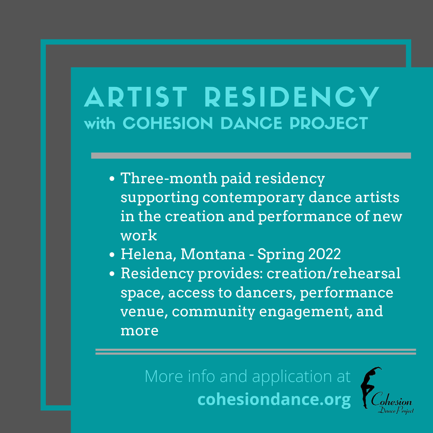 Cohesion Dance Project in Helena, Montana is seeking a dance artist for its 2022 Artist Residency.  This paid residency supports contemporary dance artists in the creative development of new work, from concept to final performance, and connects them with wider audiences through outreach, studio classes, and community engagement.