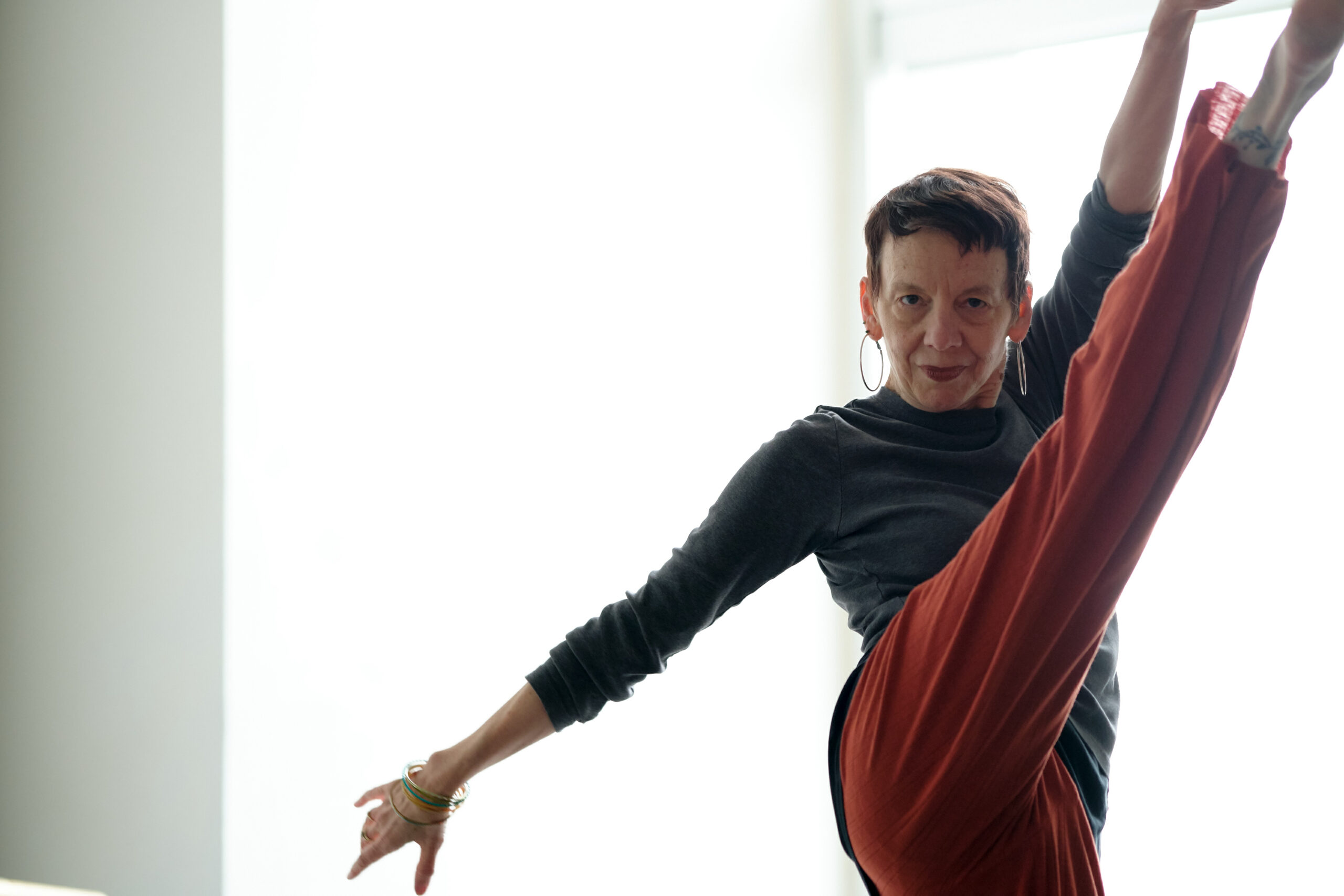 A light-skinned dancer with white hair supports herself on one hand and one knee, with the other arm and leg outstretched