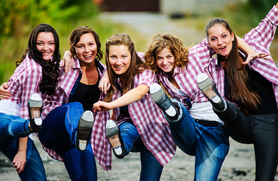 Ballet students jump in with pointed toes, ankles crossed and arms en bau