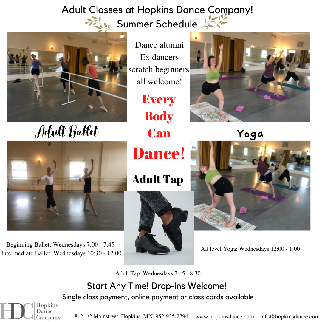 Ongoing adult classes for the summer at Hopkins Dance Company in ballet, tap, and yoga.