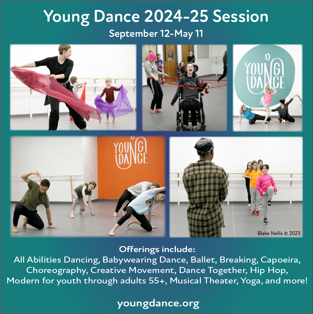 The 2024–25 Session includes All Abilities Dancing, Babywearing Dance, Ballet, Breaking, Capoeira, Choreography, Creative Movement, Dance Together, Hip Hop, Modern for youth through adults 55+,  Musical Theater, Yoga and more! Plus, we offer opportunities to perform around the Twin Cities and work with professional choreographers through the Young Dance Performing Company.
