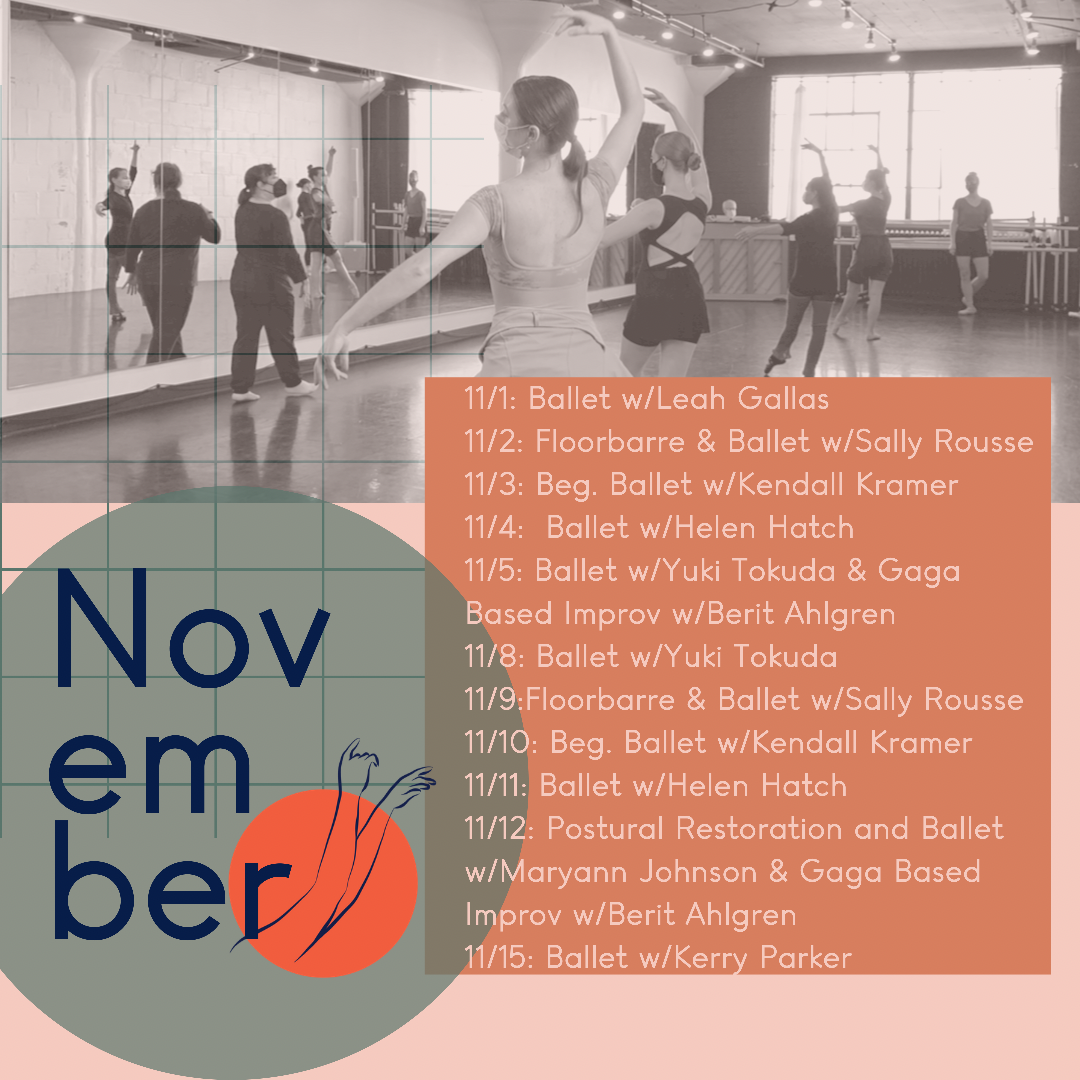 Community Movement Collective Open Classes: CoMoCollective offers small group classes for professionals and adult dancers alike to keep us moving together during this uncertain time. For safety, class sizes are limited and masks are required throughout class.