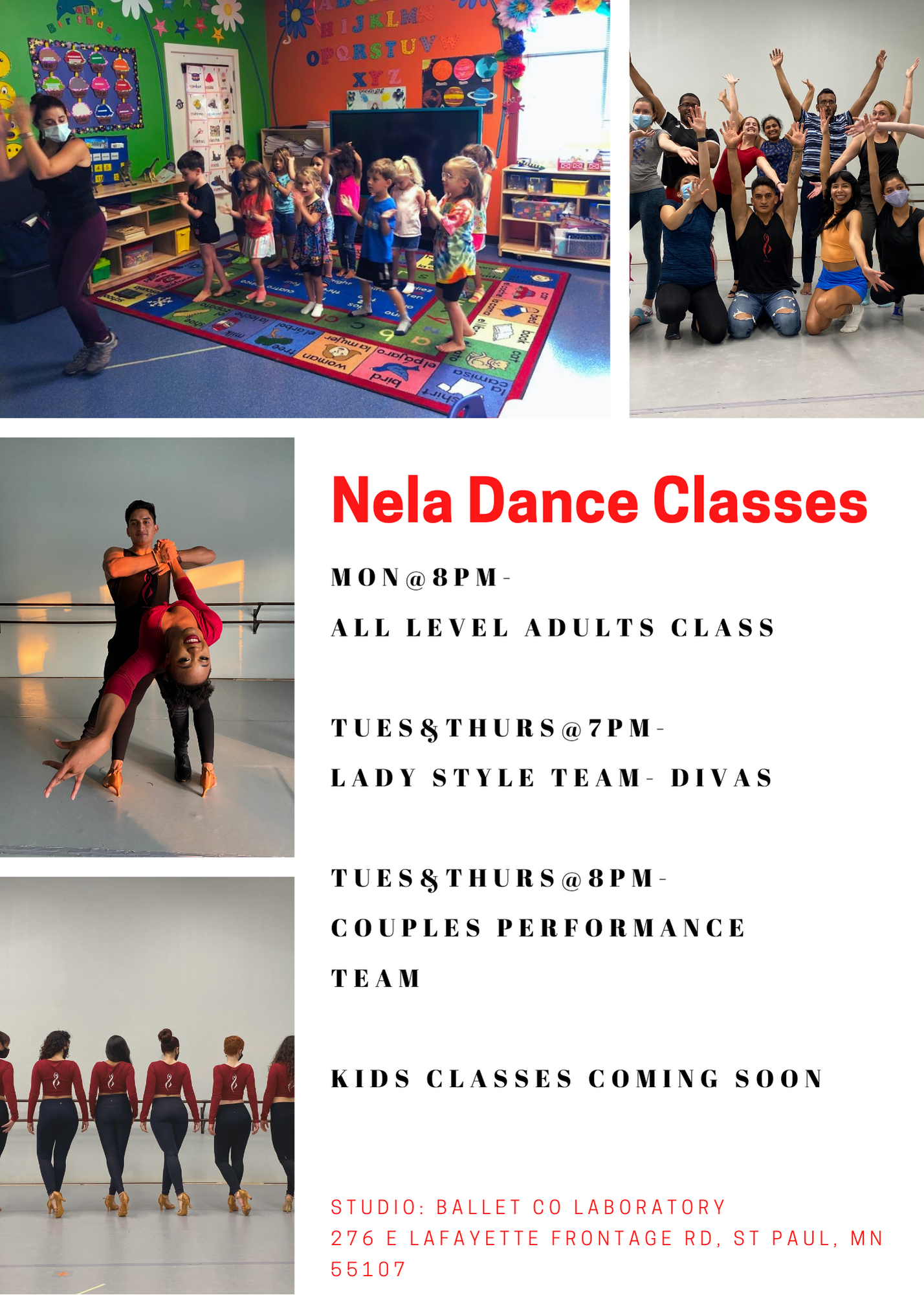 Nela Dance offers Salsa and Bachata classes at Ballet Co.Laboratory studio in St Paul. Salsa is a fun Cuban rhythm and Bachata is a sensual Dominican Republic rhythm. These dances are amazing, full of energy and sexiness. If you know about these two rhythms, you know what I’m talking about, and if you don’t, don’t hesitate to come and try it out!