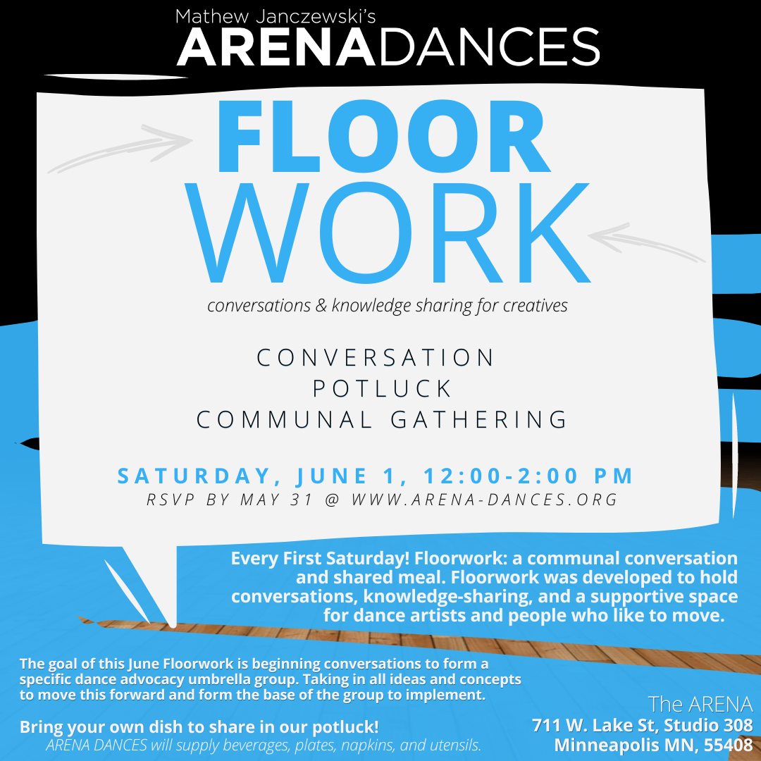Conversation will be held over a communal meal – bring your own dish to share in our potluck! ARENA DANCES will supply beverages, plates, napkins, and utensils. Floorwork was developed to hold conversations, knowledge-sharing, and a supportive space for dance artists and people who like to move. Attendees are asked to fill out a new RSVP form for each monthly Floorwork event.