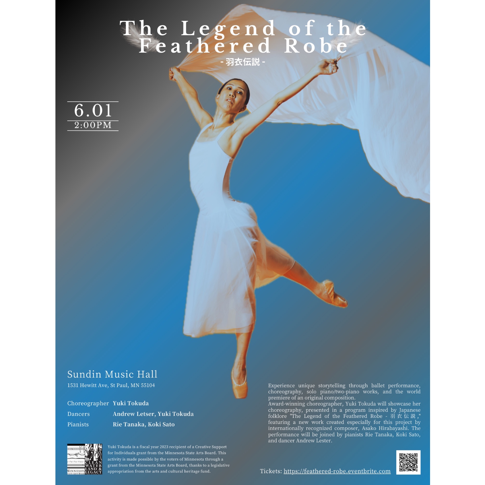 Experience unique storytelling through ballet performance, choreography, solo piano and two-piano works, and the world premiere of an original composition. Award-winning choreographer Yuki Tokuda will showcase her choreography presented in a program inspired by Japanese folklore, “The Legend of the Feathered Robe – 羽衣伝説,” featuring a new work created especially for this project by internationally recognized composer Asako Hirabayashi.
