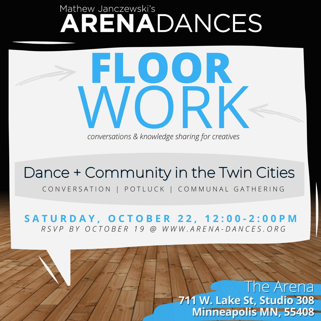 Floorwork was developed by Mathew Janczewski and ARENA DANCES to hold conversations and knowledge sharing spaces for creatives. Join ARENA DANCES’ Founder and Artistic Director, Mathew Janczewski, for a communal conversation and shared meal on the culture and climate of dance today in the Twin Cities.