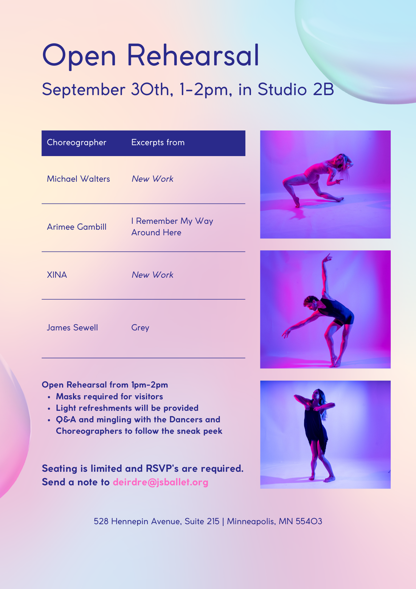 Seating is limited and RSVPs are required. Please send a note to deirdre@jsballet.org to reserve your spot!