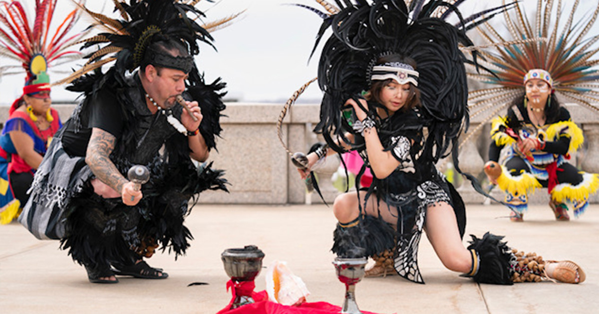 Dancers Nieya Amezquita, Gabby Garcia, Jennifer Ilse, Jesse Schmitz-Boyd, and Joseph Wurm perform Minotaur with contemporary dance and mask performance. Accompanying the performers and immersing the entire audience is live music and sound score by Dameun Strange, and a live animated projection design by OLA Co-Artistic Director Paul Herwig, with costume design by long-time OLA collaborator, Kym Longhi.