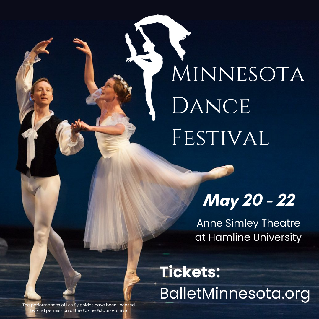 Ballet Minnesota presents the 33rd annual Minnesota Dance Festival this weekend May 20 – 22 at the Anne Simley Theatre at Hamline University in St. Paul. Featuring Les Sylphides, restaged by Cheryl Rist, and Special Guest Artists including: CAAM Chinese Dance Theater, Cheremosh Ukrainian Dance Ensemble, Classical Ballet Academy, Crash Dance Productions, Eva Igo, Jim Lieberthal, Juliana Johnson, Kala Vandanam, and Keane Sense of Rhythm. Come see these incredible artists and enjoy the return of this exciting spring festival! Get your tickets NOW!