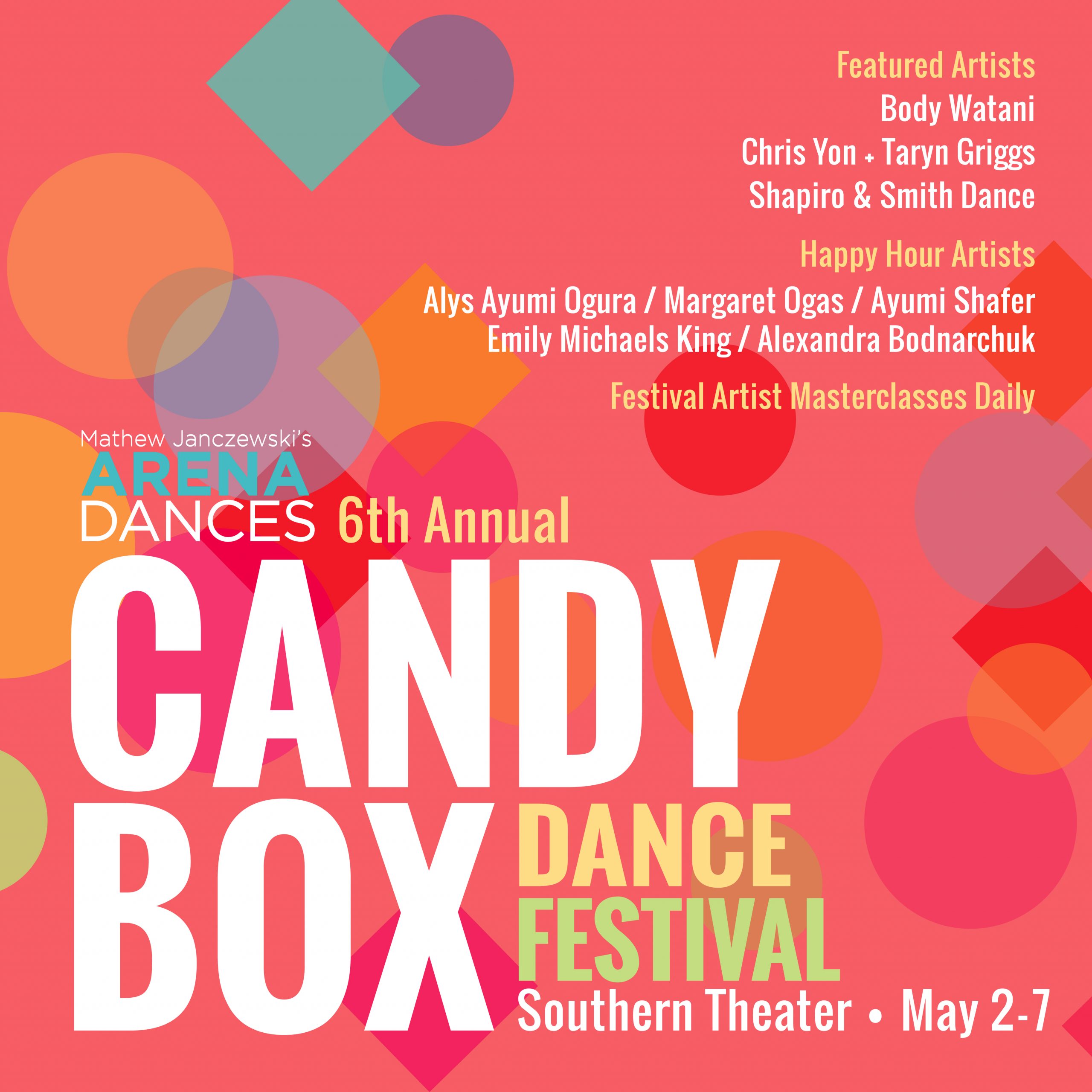 We would like to officially invite you to ARENA DANCES’ upcoming celebration for the opening night of the 6th Annual CANDY BOX Dance Festival, May 2-7, 2022 at The Southern Theater.