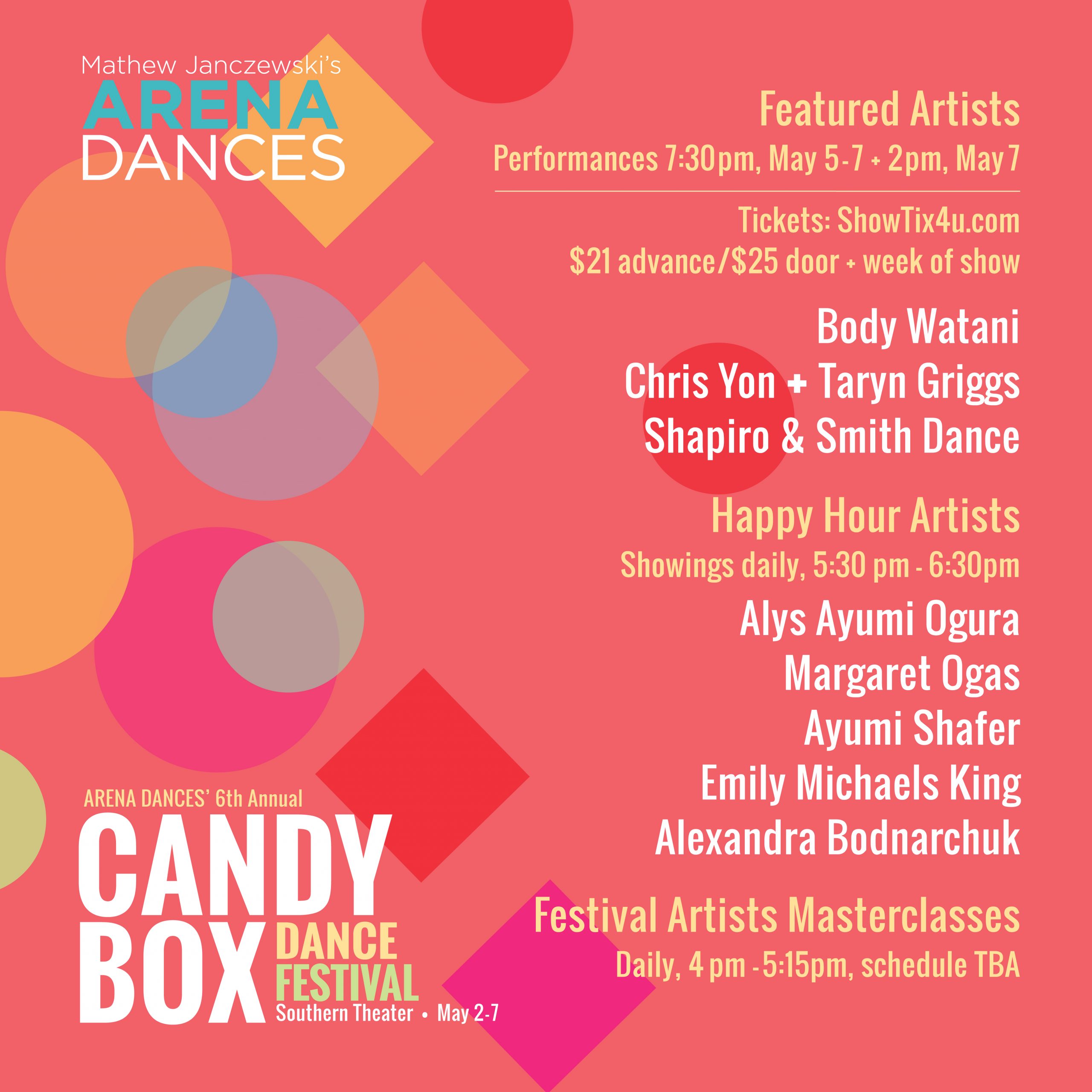 CANDY BOX, presented by Mathew Janczewski’s ARENA DANCES is an annual, eclectic gathering of performances, masterclasses, and work-in-progress showings. This year’s festival features a range in levels of experiences, aesthetics, and choreographic voices to offer a diverse array of treats!