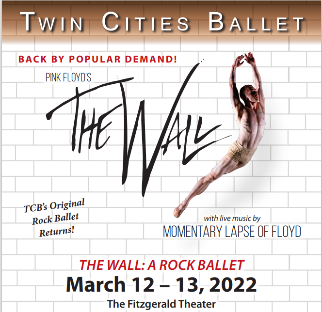 Twin Cities Ballet’s groundbreaking hit show makes its St. Paul premiere at the historic Fitzgerald Theater, with live music by popular local band, Momentary Lapse of Floyd—a first for all three organizations. Based on Pink Floyd’s iconic 1979 rock opera, TCB’s The Wall: A Rock Ballet is an ingenious fusion of genres that will captivate ballet patrons, music fans, and the artistically curious alike.