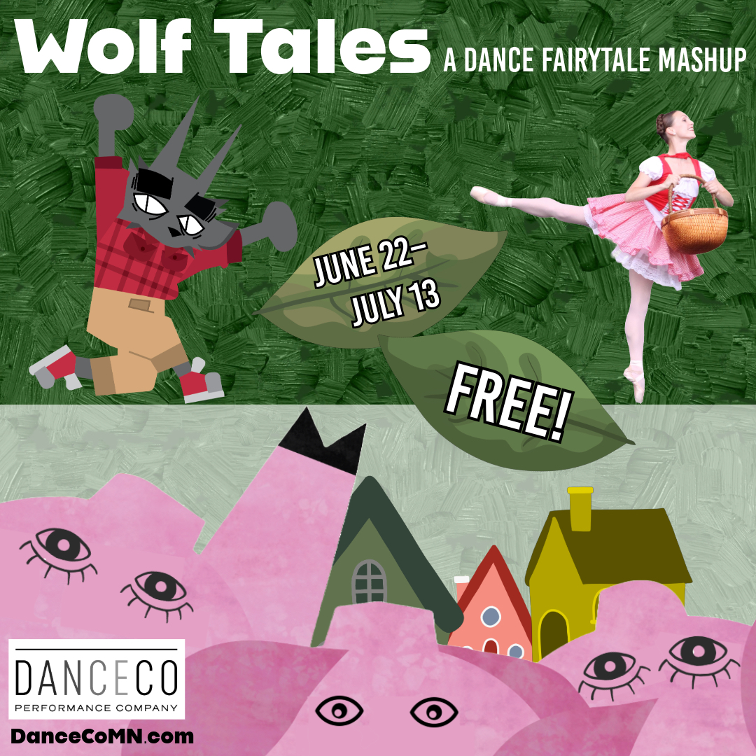 DanceCo returns to the stage this summer with a series of free, interactive, family-friendly performances. Wolf Tales is a mashup of the familiar fairy tales Peter and the Wolf, Little Red Riding Hood, and the Three Little Pigs. The story is told by the Wolf, who is not big or bad, just misunderstood — and wants to set the record straight!