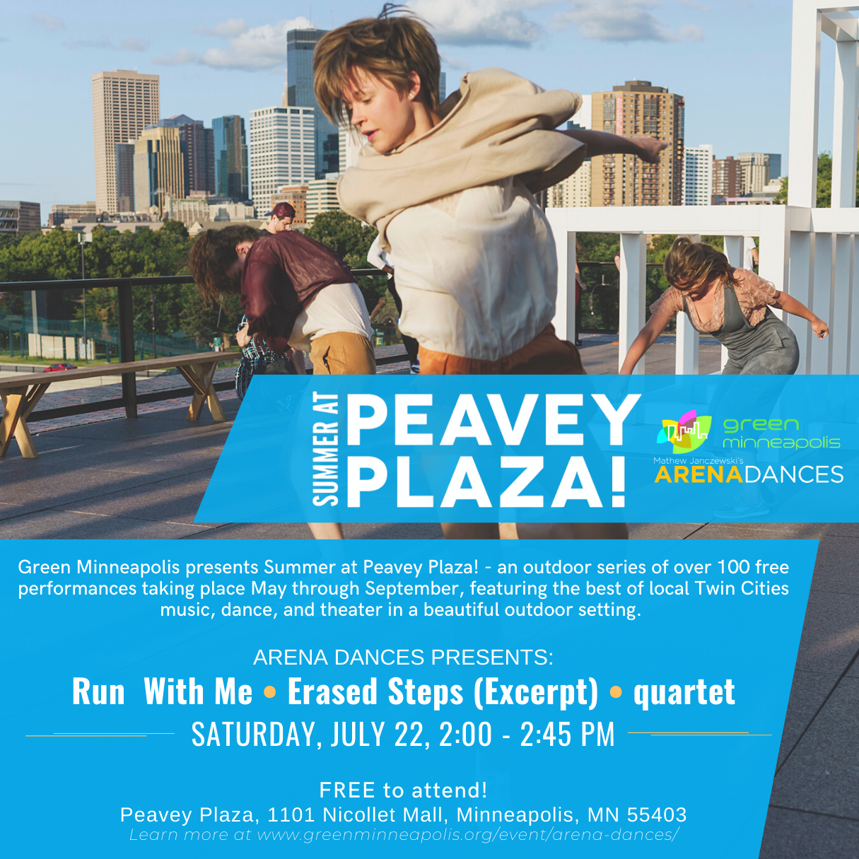 Green Minneapolis presents Summer at Peavey Plaza – an outdoor series of over 100 free performances taking place May through September, featuring the best of local Twin Cities music, dance, and theater in a beautiful outdoor setting. ARENA DANCES is thrilled to return to Peavey Plaza again this year!