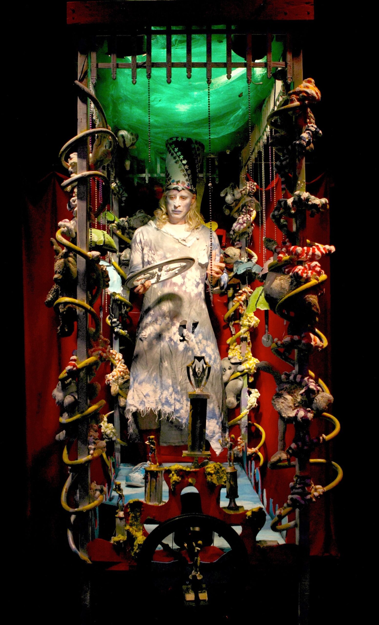 At once dreamlike, unsettling, and absurd, Off-Leash Area’s new show, The Knave of Knives – The Duchess of Dawn, introduces two strange and haunting figures from an otherworldly court who engage in a fantastical struggle for power over the multiverse. Taking place in an immersive installation surrounding both stage and audience, the show is performed with movement and music/sound, inspired (loosely) by string theory, and is populated with melancholy stuffed animals and mysterious trophies, dispersed among the fragile threads of a clandestine karmic history.