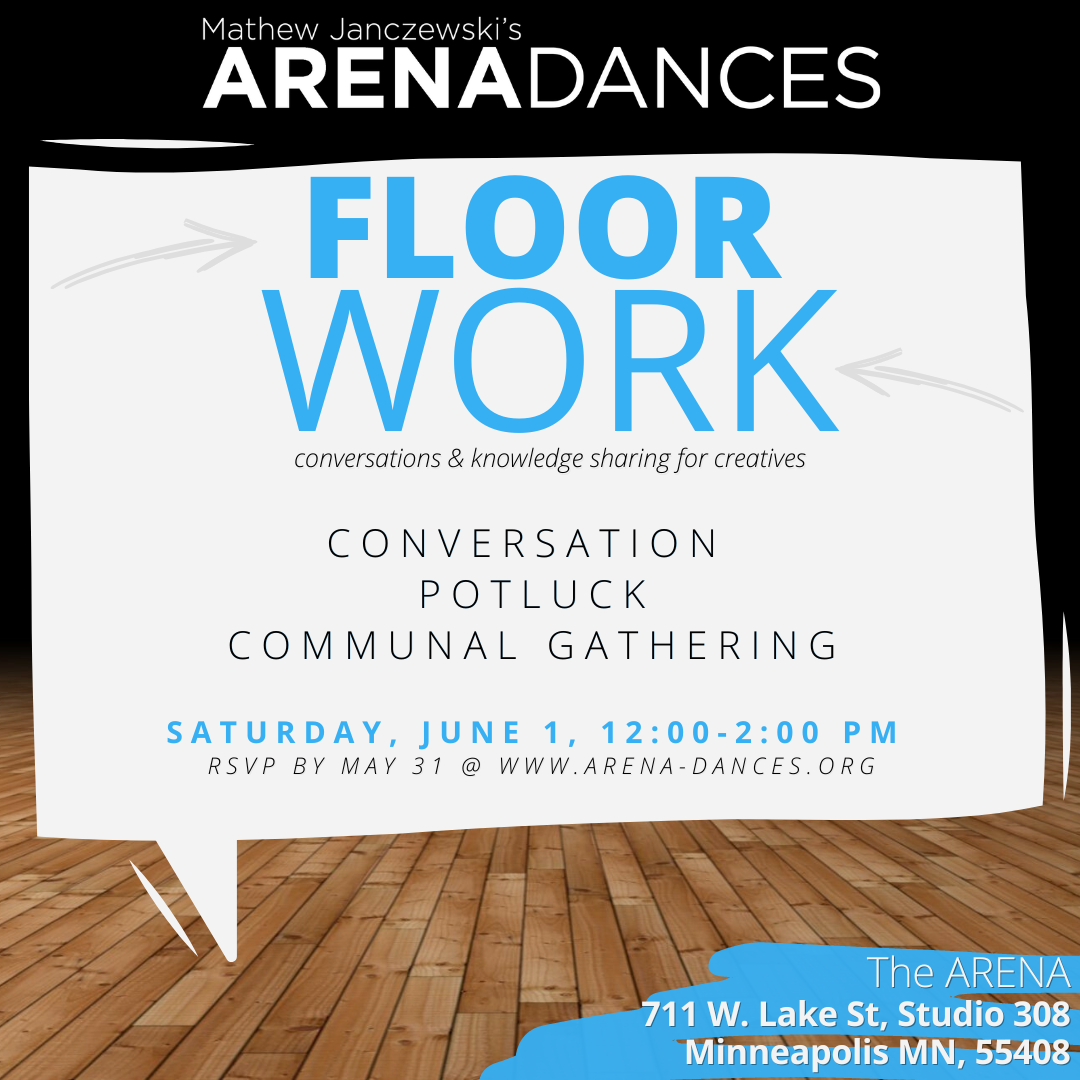 Conversation will be held over a communal meal – bring your own dish to share in our potluck! ARENA DANCES will supply beverages, plates, napkins, and utensils. Floorwork was developed to hold conversations, knowledge-sharing, and a supportive space for dance artists and people who like to move. Attendees are asked to fill out a new RSVP form for each monthly Floorwork event.