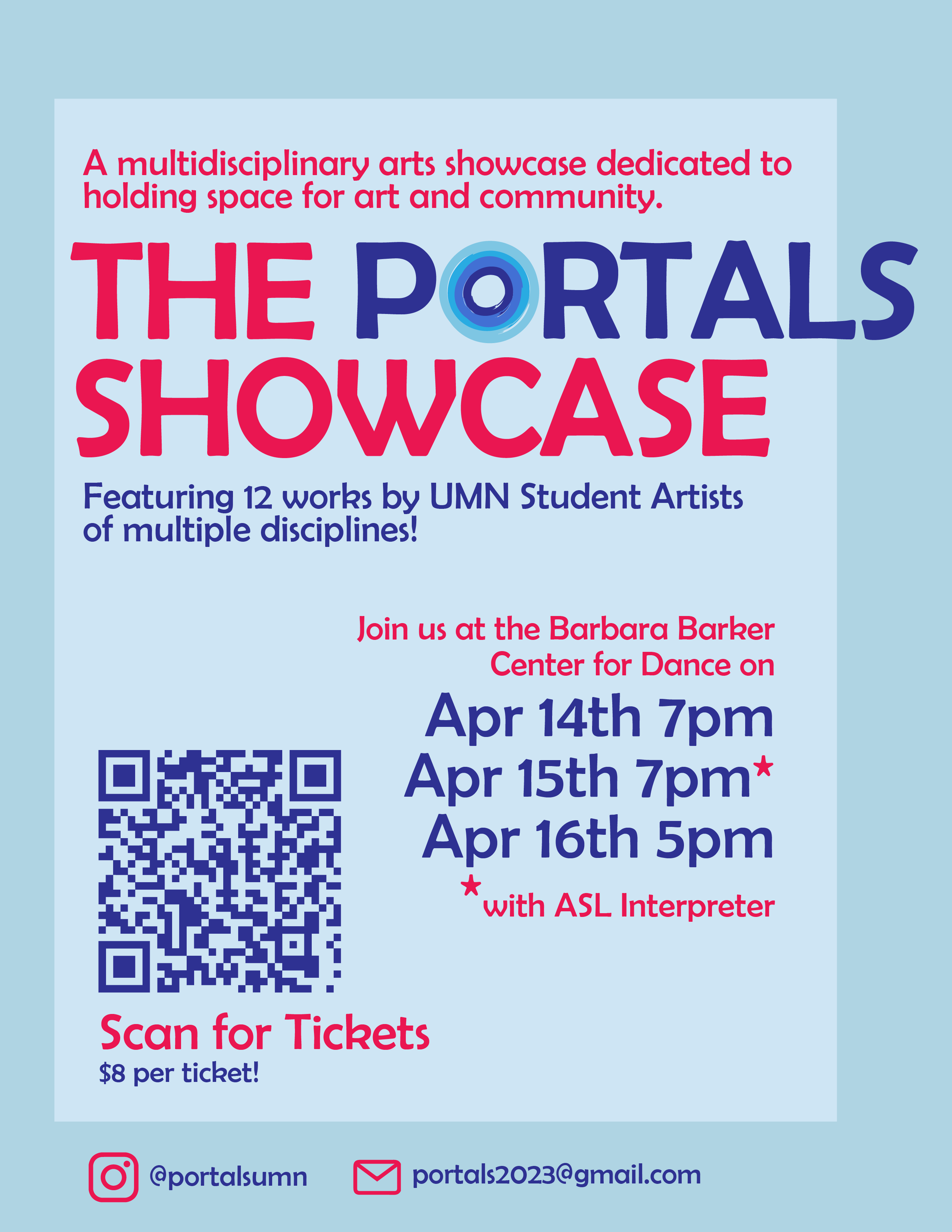 The Portals Showcase is a multidisciplinary arts showcase dedicated to holding space for art and community. Portals feature a group of 12 UMN student artists, curated by students of the UMN Dance program.