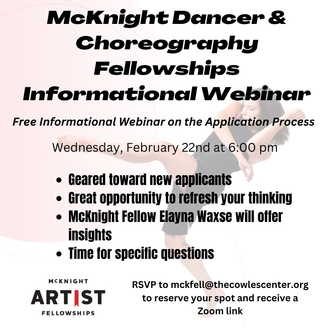 The McKnight Fellowships for Dancers and the McKnight Fellowships for Choreographers annually award three $25,000 fellowships to mid-career Minnesota dancers and three $25,000 fellowships to mid-career choreographers. Applications are due Wednesday, March 29, 2023 at 3:00pm CT. See full guidelines and application details at McKnightDanceChoreo.org.