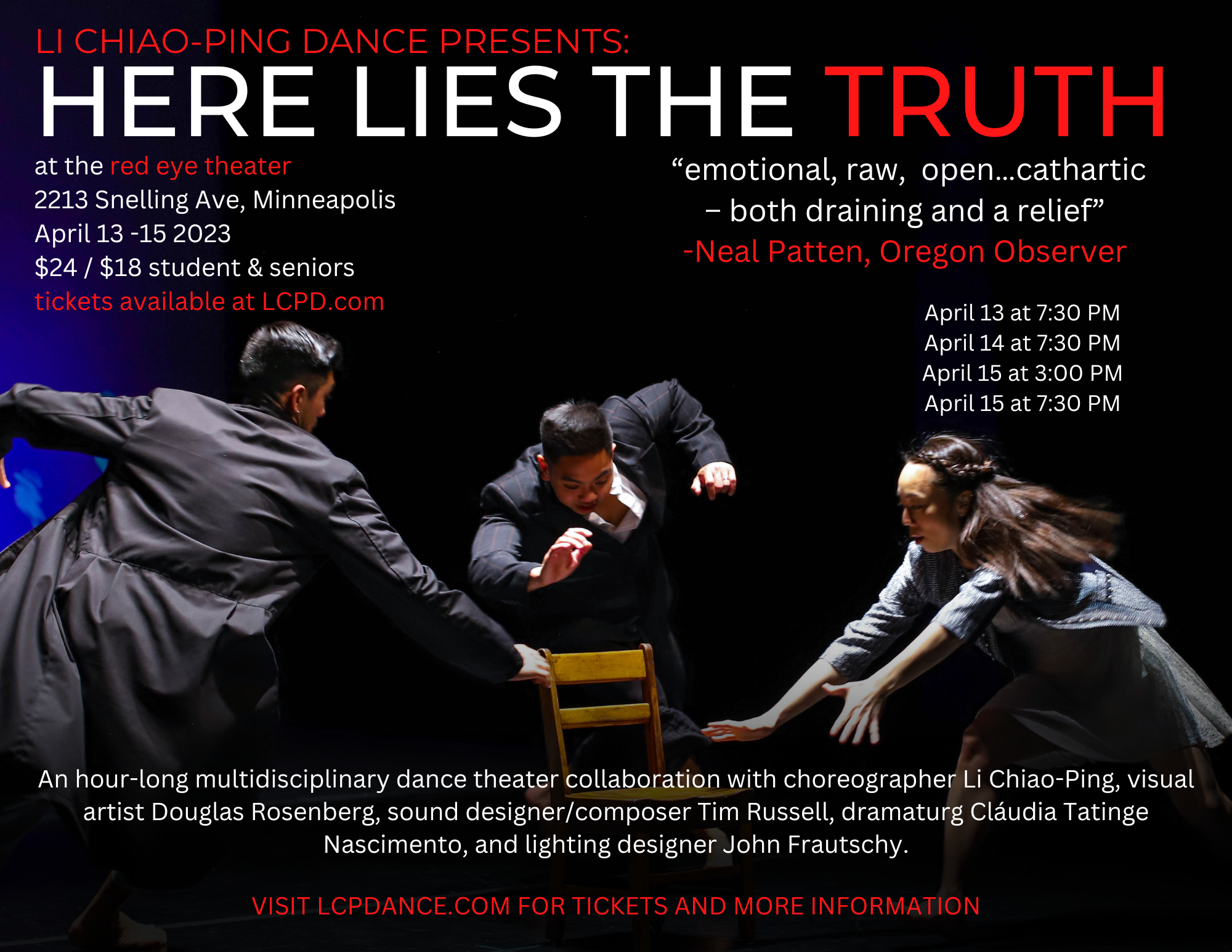 Madison, WI-based contemporary dance company, Li Chaio-Ping Dance, presents Here Lies the Truth at the Red Eye Theater in April 2023. This hour-long multidisciplinary dance theater work is a collaboration among choreographer Li Chiao-Ping, visual artist Douglas Rosenberg, sound designer/composer Tim Russell, dramaturg Cláudia Tatinge Nascimento, and lighting designer John Frautschy.