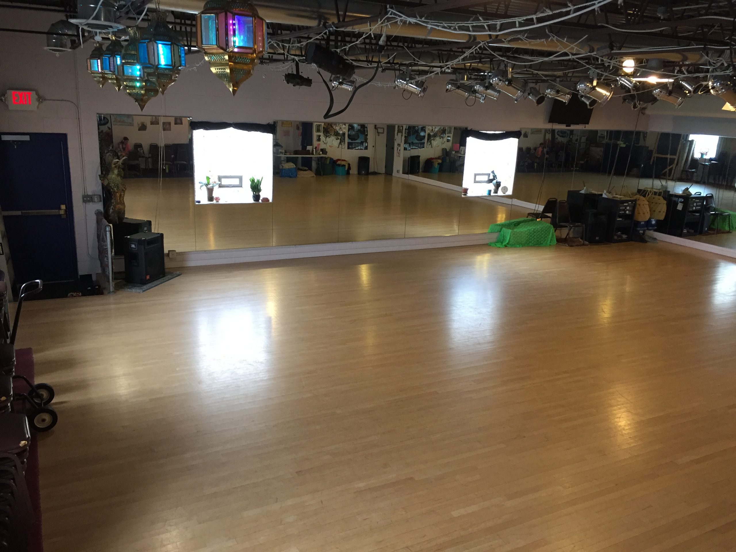 Our space offers 1,305 square feet (30×40) of sprung floor, Marley dance flooring, full wall-length mirrors (with curtains for covering if preferred), free wifi and a changing room.