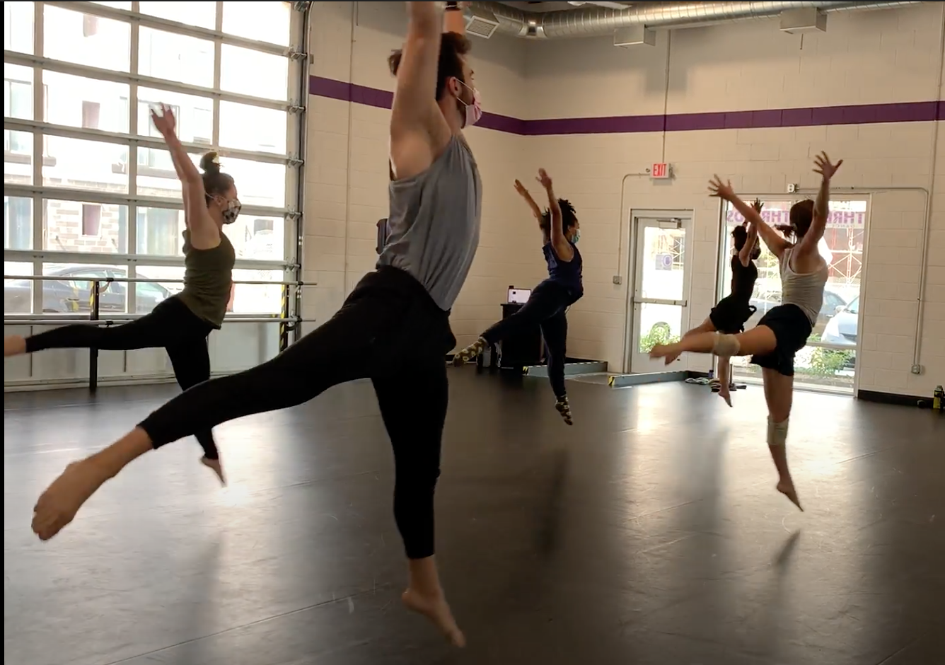 Our 1,480 square foot space has a professional-grade speaker sound system, sprung floors, barres, and mirrors; is ADA compliant and has two gender-neutral changing rooms. Its large windows and garage door allow for an abundance of natural light and fresh air.