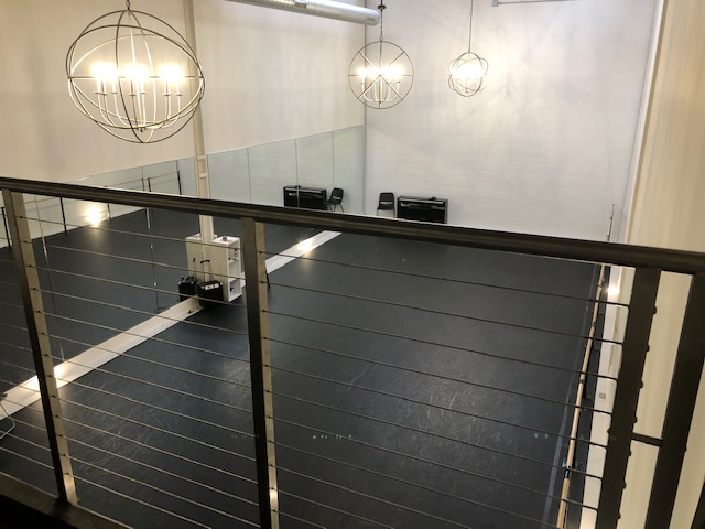 Studio 1 has 1700 square feet of sprung floor, full wall-length mirrors, Rosco Adagio Marley dance floor, high ceilings, sky lights, and three chandeliers.
