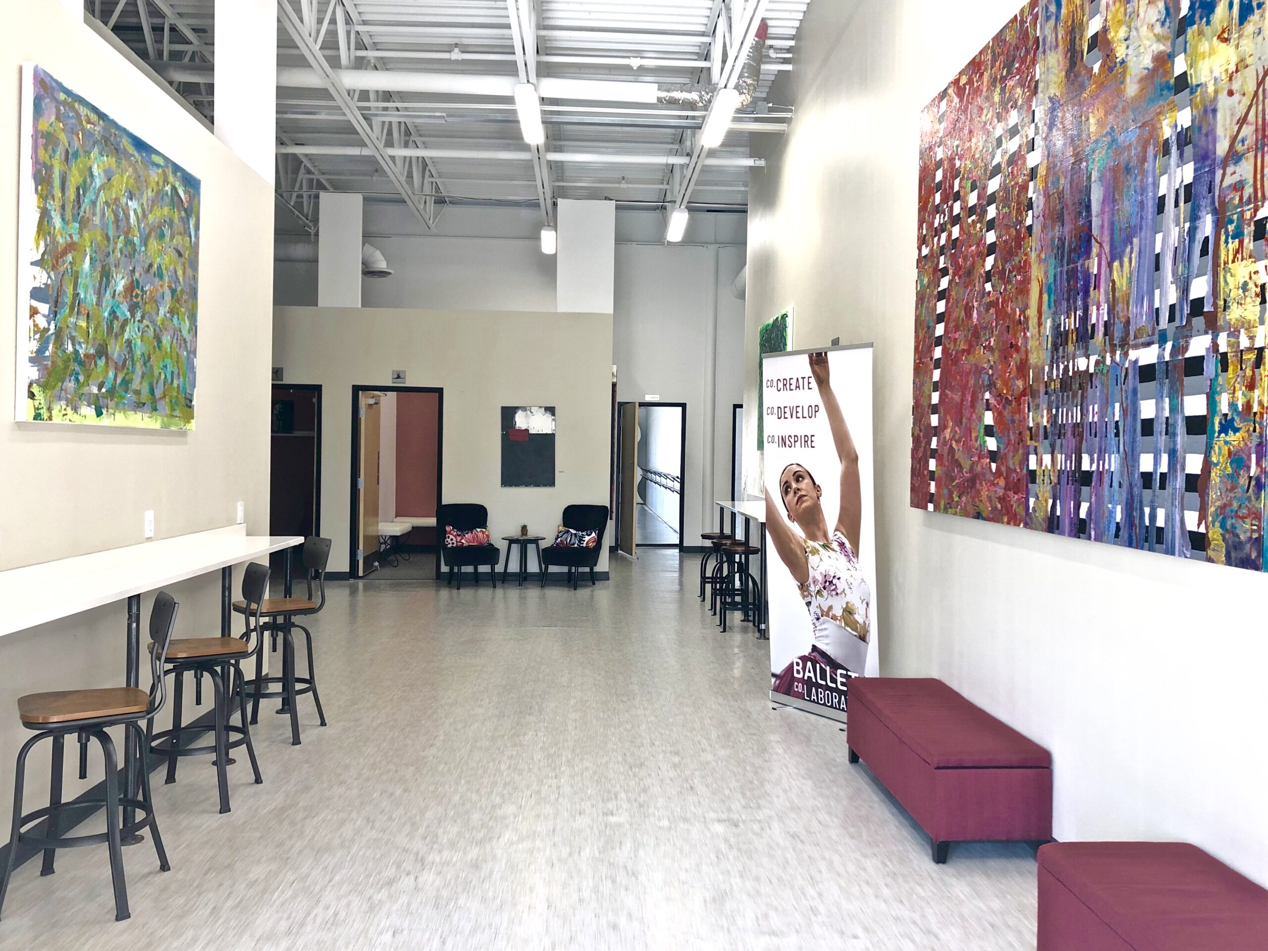 We have five studios at Ballet Co.Laboratory with sprung floors, floor-to-ceiling mirrors, and barres, plus four gender-neutral restrooms, changing rooms, and comfortable lobby space with Wi-fi access and ample seating. The entire facility is HVAC heated and cooled.