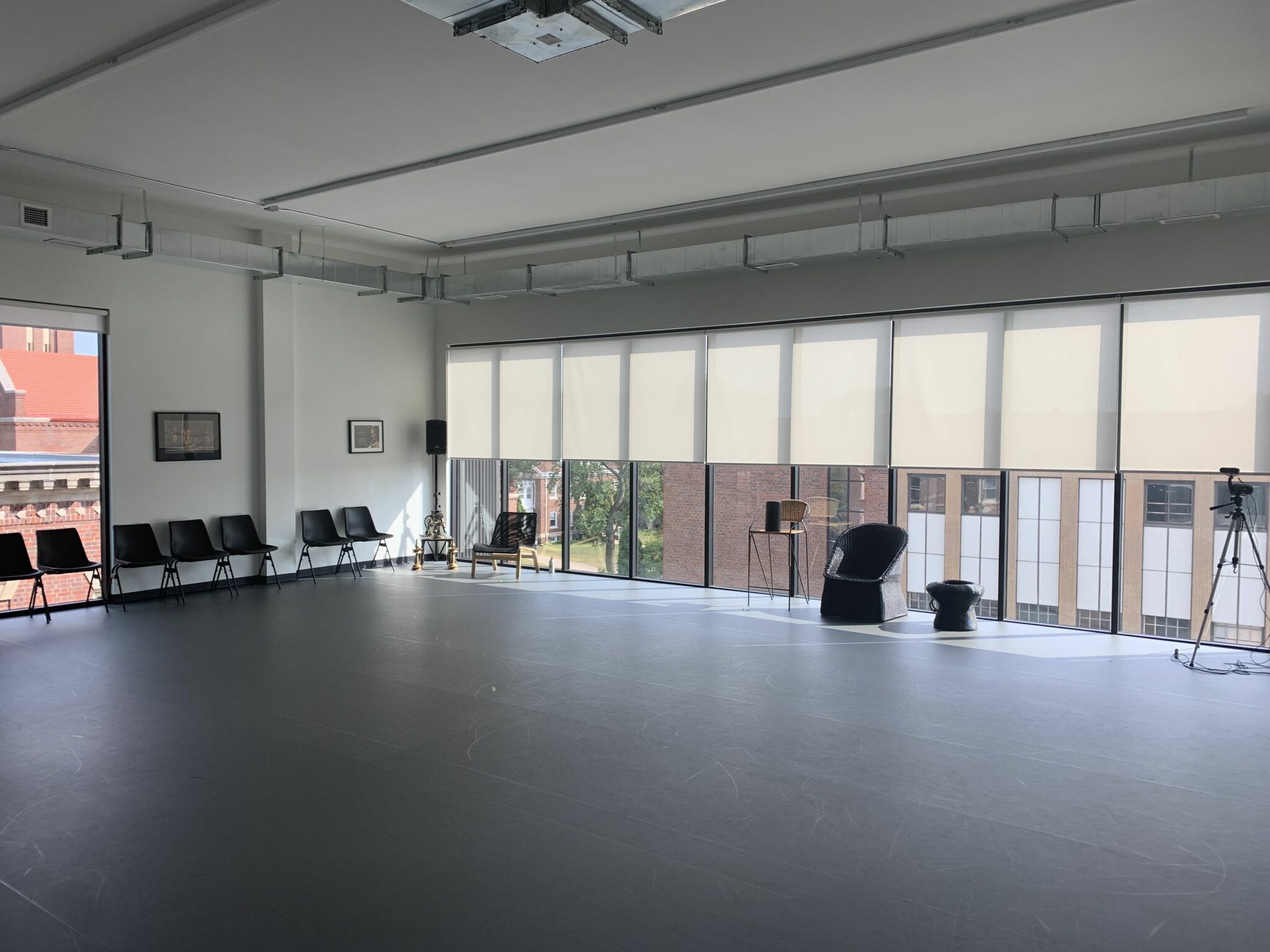 The studios are newly equipped with sprung Harlequin Marley flooring, a Bluetooth speaker system, and wifi. A projector with AV adapters is available by request. Studio 2 has ballet barres and a mirror. The studio has a clear COVID safety plan, including regular disinfecting of all floors and surfaces and a new HVAC system that refreshes the air 7-8 times per hour.